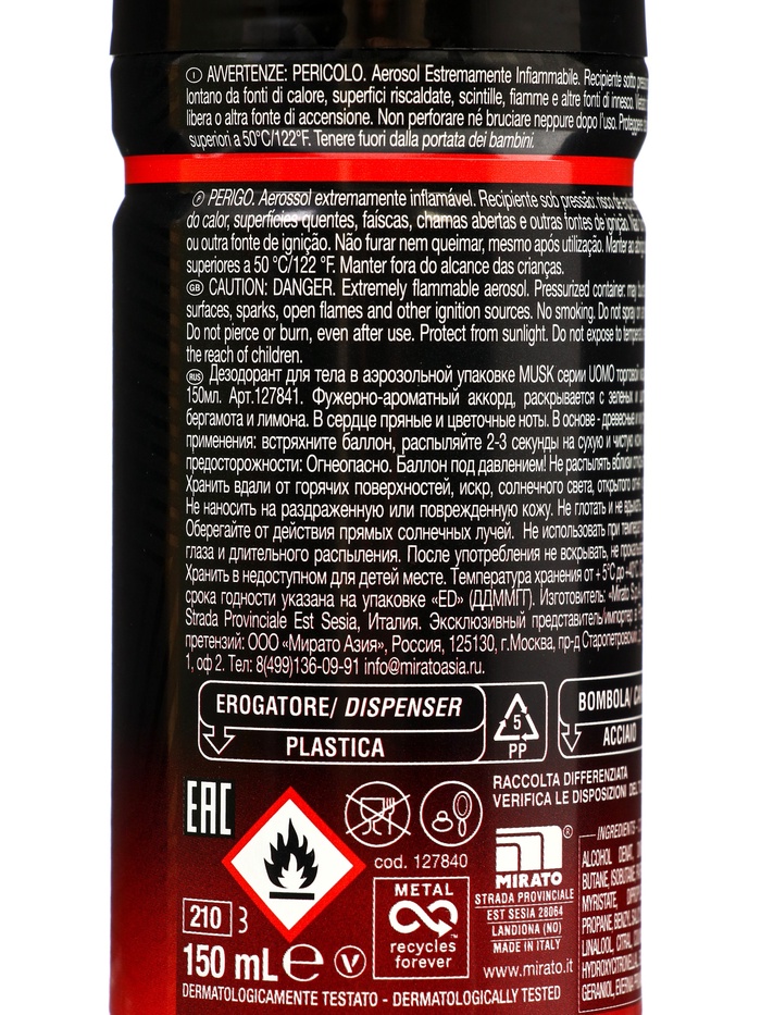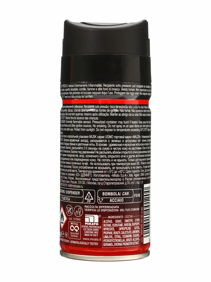 Этот аэрозольный дезодорант сочетает в себе стойкий аромат мускуса с надёжной защитой от запаха пота, сохраняя ощущение свежести на весь день. Тонкий, но выразительный шлейф подчёркивает силу характера и уверенность в себе, не перебивая парфюм, а дополняя образ.