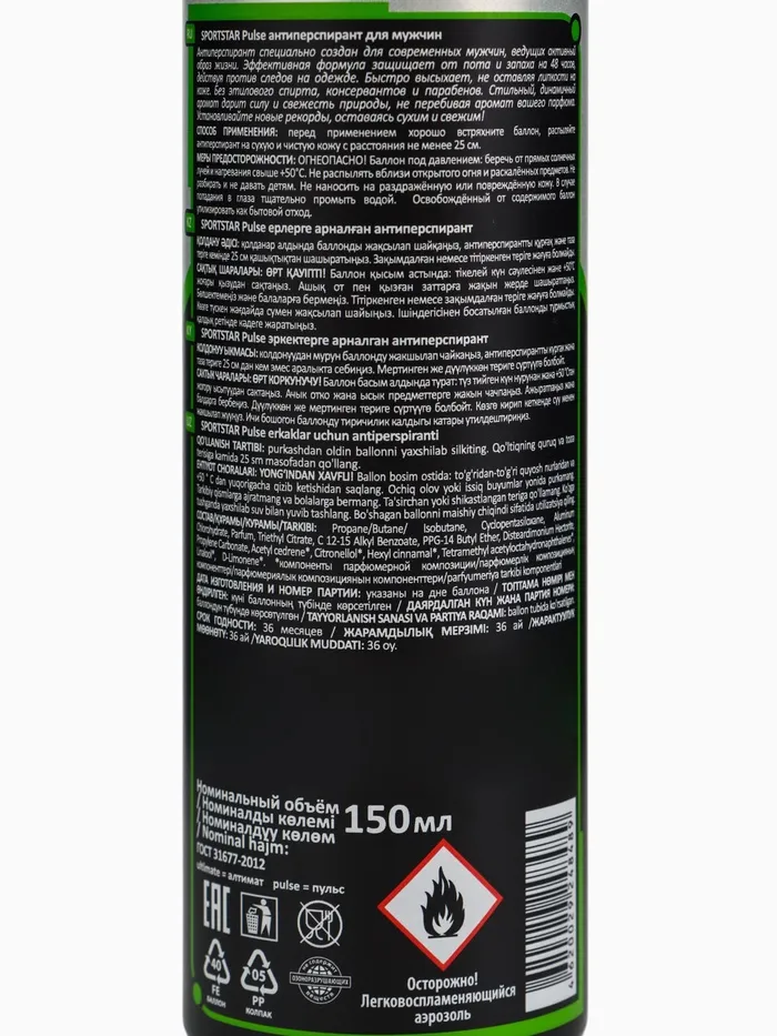 SPORTSTAR Active антиперспирант для мужчин специально создан для современных мужчин, ведущих активный образ жизни. Эффективная формула защищает от пота и запаха на 48 часов, действуя против следов на одежде. Быстро высыхает, не оставляя липкости на коже. Без этилового спирта, консервантов и парабенов. Стильный, динамичный аромат дарит силу и свежесть природы, не перебивая аромат вашего парфюма. Устанавливайте новые рекорды, оставаясь сухим и свежим!