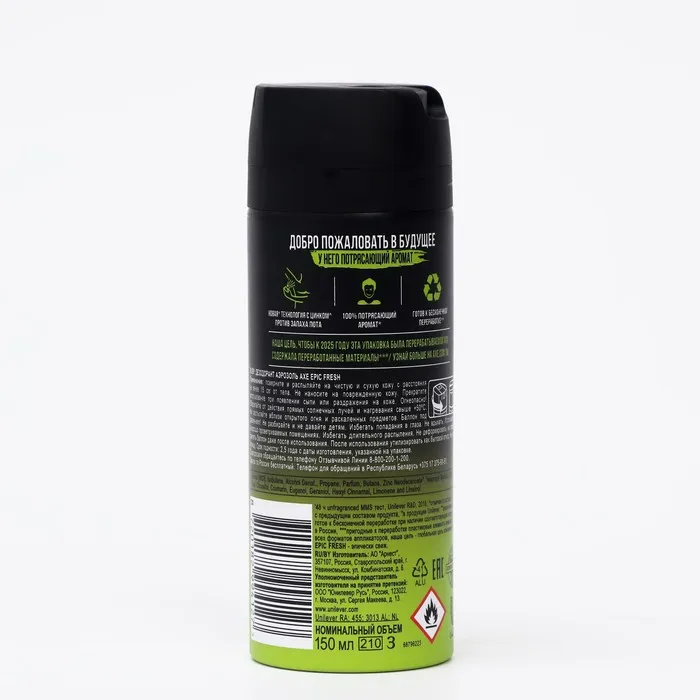 Описание: оцени крутую новинку от ""AXE"" – дезодорант-аэрозоль ""Epic Fresh"". Твоя уверенность и удовольствие при каждом использовании! 100% топовый аромат, как всегда, разработанный в сотрудняичестве с одняим из лучших парфюмерных домов, на этот раз раскрывается мощными акватическими аккордами в сочетании с эпичной свежестью сочного грейпфрута и нотками пряного кардамона. Современный смелый фужерный аромат, и самая долгая свежесть от ""AXE""! В основе формулы – антибактериальная технология ""ZINC ZAP"", – твоя усиленная неприятного запаха на основе цинка. Она препятствует появлению неприятного запаха, при этом не содержит солей алюминия и позволяет коже дышать. Забудь про следы на одежде и неприятный запах. Только ощущение свежести, и крутой современный аромат, который привлечет к тебе еще больше нужного внимания. Каждый аромат ""AXE"" – это парфюмерный шедевр, созданный при участии лучших парфюмерных домов мира. Упаковка в актуальном дизайне займет достойное месяцевто на твоей полке.