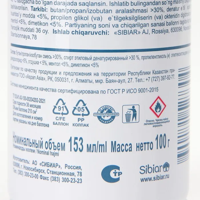 Состав: бутан/ пропан/изобутан смесь >30%, этанол >30 %, пропиленгликоль (и) этилгексилглицерин (и) октенидина дигидрохлорид<5%, отдушка < 5%, ментол <5%, диметикон<5%.