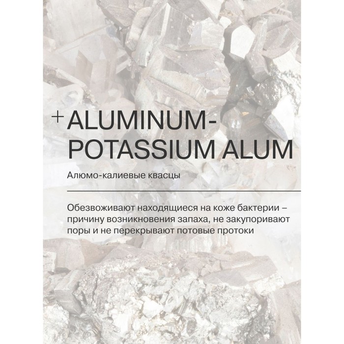 Основа дезодоранта - алюмо-калиевые квасцы, обезвоживают находящиеся на коже бактерии - причину возникновения запаха, не закупоривают поры и не перекрывают потовые протоки.