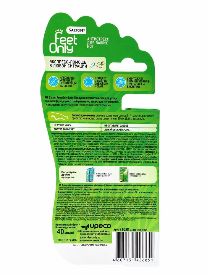 Дезодорант-мини для ног SALTON Lady мгновенно устраняет неприятный запах благодаря специальной формуле нейтрализации, обеспечивая комфорт и уверенность в любой ситуации.