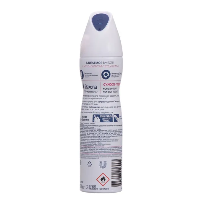 Полный состав: isobutane, aluminum chlorohydrate, propane, cyclopentasiloxane, ppg-14 butyl ether, parfum, butane, disteardimonium hectorite, propylene carbonate, caprylic/capric triglyceride, gelatin crosspolymer, cellulose gum, sodium benzoate, aqua, hydrated silica, sodium starch octenylsuccinate, maltodextrin, hydrolysed corn starch, silica, bht, alpha-isomethyl ionone, benzyl alcohol, benzyl salicylate, citronellol, coumarin, geraniol, hexyl cinnamal, limonene, linalool.