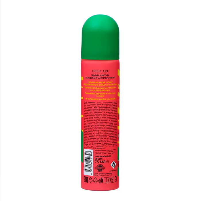 Дезодорант-антиперспирант Delicare обладает солнечным ярким ароматом для позитивного заряда на весь день. Улучшенная формула разработана специально для защиты от потоотделения. Равномерно наносится и быстро сохнет, а также не оставляет следов на одежде.