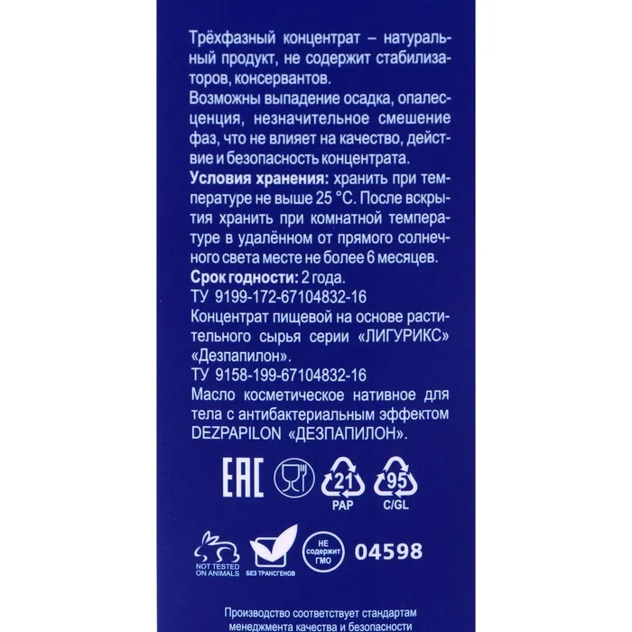 Концентрат состоит из трёх раздельных фаз, укомплектован тремя специальными насадками для каждой фазы для применения наружно и внутрь, специальными биогенными пластырями для предотвращения растекания средства при нанесении на бородавку, гелем-активатором, предназначенным для нанесения непосредственно на бородавку.