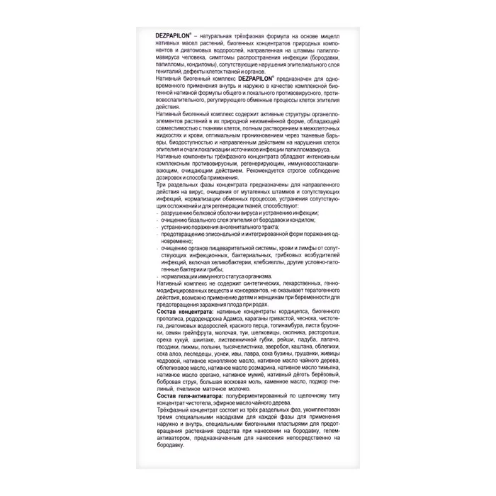 Нативный биогенный комплекс «Dezpapilon» предназначен для одновременного применения внутрь и наружно в качестве комплексной биогенной нативной формулы общего и локального противовирусного, противовоспалительного, регулирующего обменные процессы клеток эпителия действия. Он содержит активные структуры органелло-элементов растений в их природной неизменённой форме, обладающей совместимостью с тканями клеток, полным растворением в межклеточных жидкостях и крови, оптимальным проникающим действием через тканевые барьеры, биологической доступностью и направленным действием на нарушения клеток эпителия и очаги локализации источников инфекции папилломавируса.
