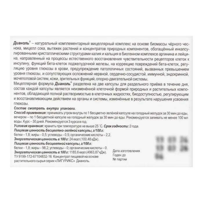 Дианоль® – биогенный порошок в саше на основе концентратов активных структур растений и природных компонентов, направленный на регуляцию обменных процессов при резистентности клеток к инсулину, нарушении функций и состояния бетаклеток поджелудочной железы, сопутствующих нарушениях со стороны сердечно-сосудистой, нервной, иммунной, костно-мышечной, эндокринной, бронхолёгочной, пищеварительной систем, зрения, кожи.