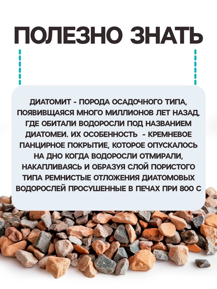 Диатомит обожженный - кремнистые отложения даитомовых водорослей просушенные в печах при 800 С. Он защищает от насекомых, грибов, плесени. Стимулирует рост крепких корней. Продлевает действие полива водой и удобрениями за счет впитывания влаги и так же постепенно отдает их растению.