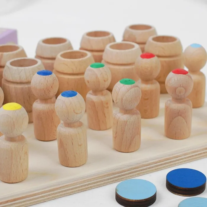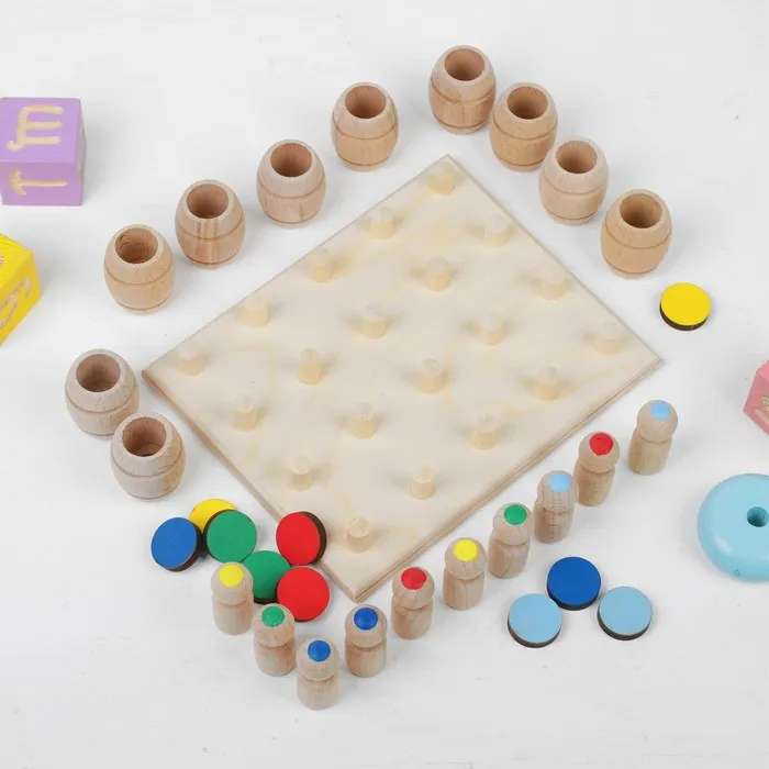 - «Военный десант». Игра, обратная предыдущей. На плоту в бочках сидят солдаты (цвет-вразнобой). Необходимо поставить человечков парами по цвету рядом со своими бочками. А бочки закрыть соответствующими крышками.
