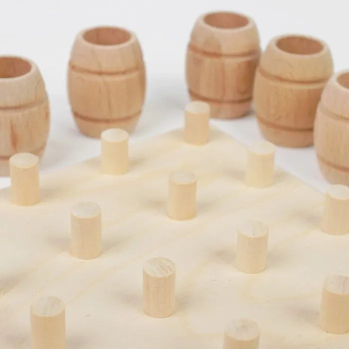 - «Кораблик тонет!» НА планшете-корабле плывут человечки. Там же расположены бочонки. Но вдруг начинается буря и корабль может утонуть. Задача малыша — спасти пассажиров, то есть снять с колышков бочонки, расставить на столе и каждого человечка пересадить с планшета в бочку, чтобы они не утонули вместе с кораблём.