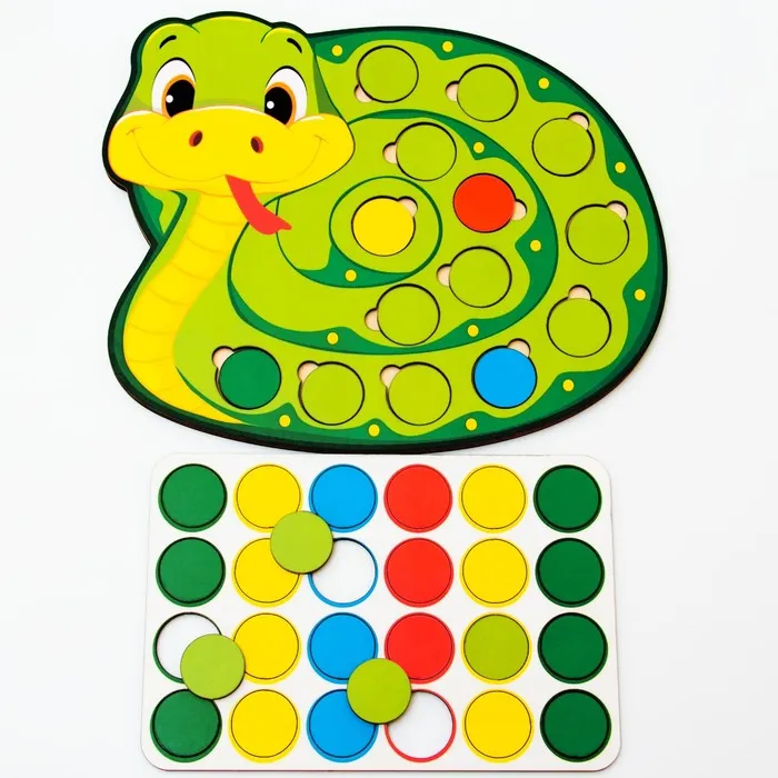 Дидактическая игра «Весёлые кружочки — Змея» — увлекательный и развивающий подарок для детей на Новый год! Эта игрушка поможет ребёнку развить мелкую моторику и ловкость, а также познакомиться с основными формами и цветами.