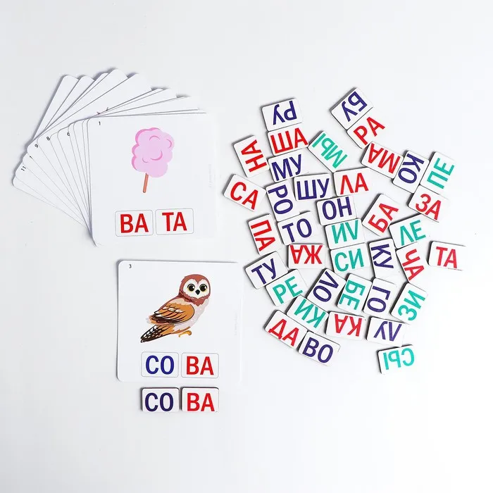 Выберите карточку, спросите у малыша, что на ней изображено.Попросите ребёнка найти нужные слоги на плашках и собрать их как пазл.Чем полезны занятия с тренажёром
