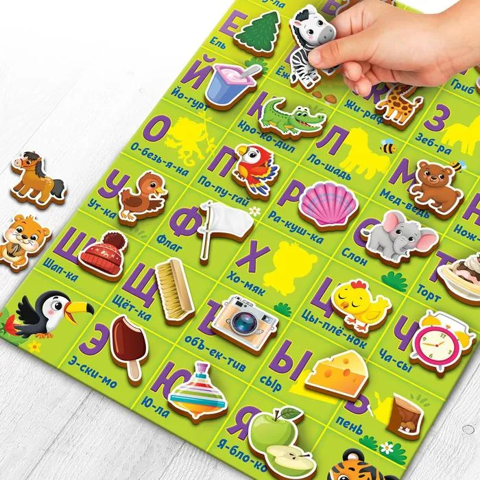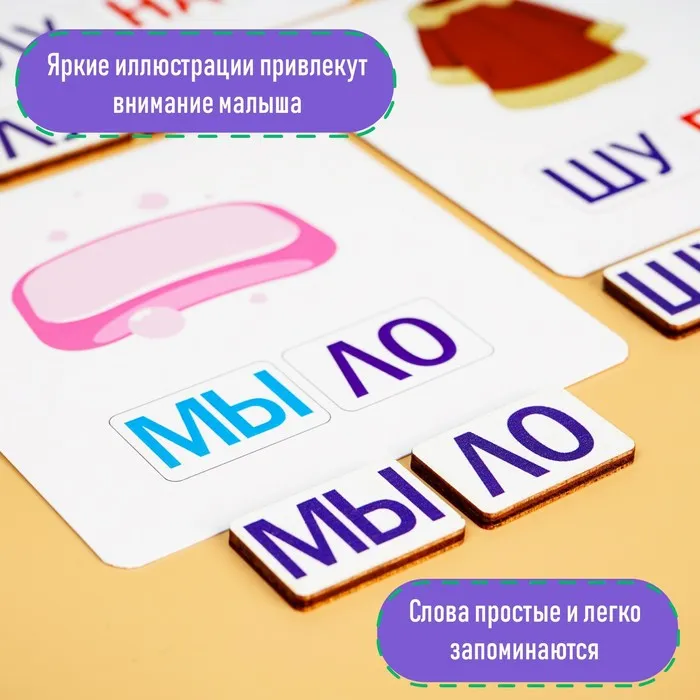 Во время игры у малыша задействуется сразу несколько уровней восприятия: слуховой (произношение слова), зрительный (картинка и цветные слоги), а также тактильный (малыш будем брать плашки со слогами и класть их на карточку). Всё это способствует эффективному запоминанию информации.
