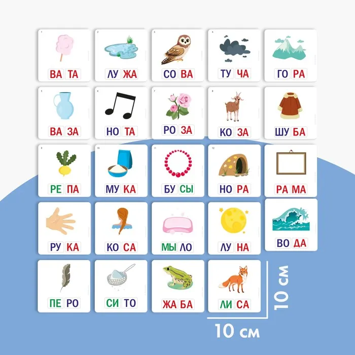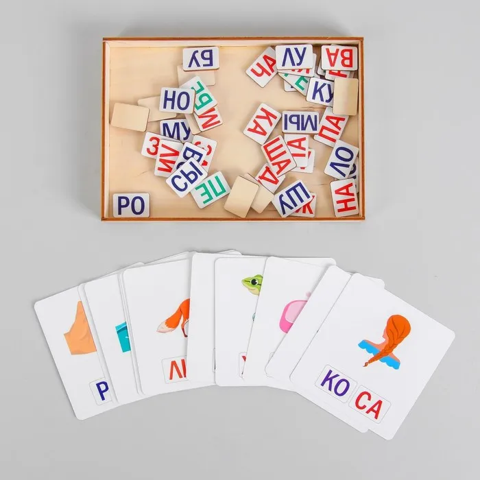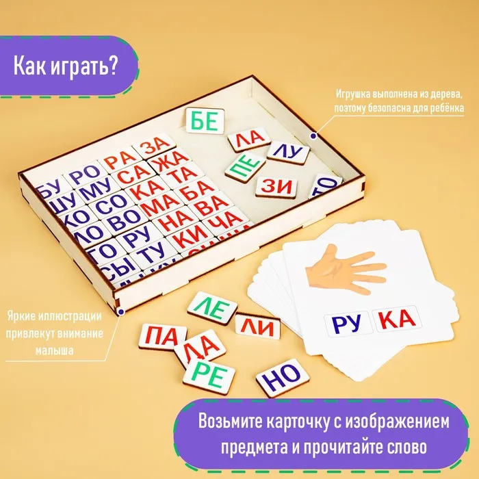 Играть очень просто:возьмите карточку с изображением предмета и прочитайте слово, пусть ребёнок повторит за вами, а потом найдёт нужные слоги среди карточек.