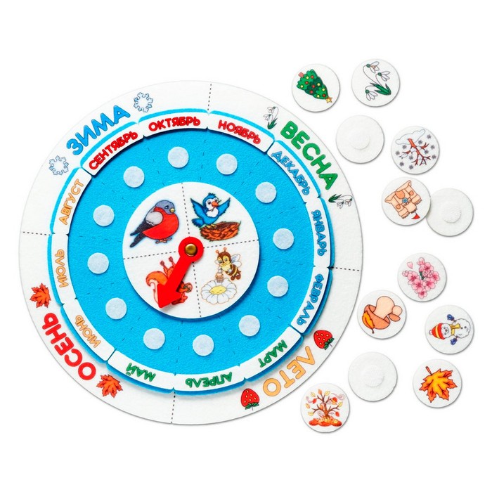 - Игра «Животный мир». Рассмотрите вместе с ребёнком маленький круг в середине коврика и предложите рассказать о жизнь животных, насекомых, птиц в разное время года (в разные месяцы). Для этого попросите ребёнка выбрать, например, белку и, поворачивая круг и стрелку, разместить ее в «домике» одного из времен года (месяца). Поговорите о жизни других животных в данное время года.
