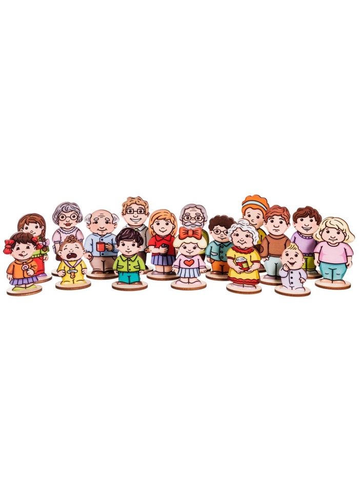 Деревянный набор «Дружная семья» — это 18 фигурок для сюжетных игр, театра и первых шагов в понимании родственных связей. Созданный для детей от 3 лет, он превращает абстрактные понятия вроде «бабушка», «внук» или «тётя» в осязаемые образы, с которыми можно играть, рассказывать истории и строить целые поколения на столе.