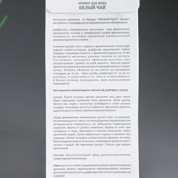 Диффузор ароматический, 50 мл, белый чай — Характеристики