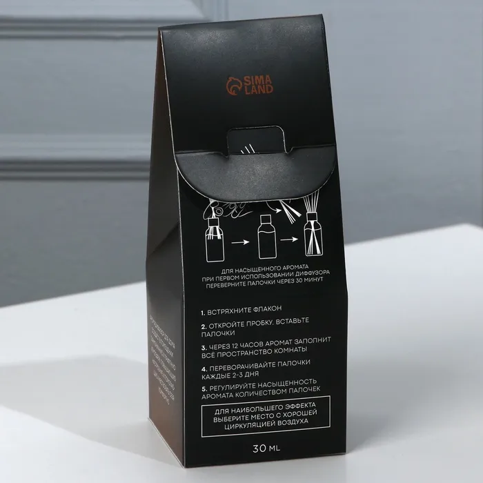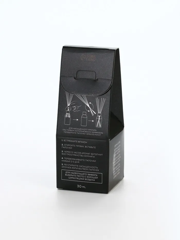 извлеките диффузор из упаковки, откройте крышку и защитный колпачок, опустите фибровые палочки в ароматизированную жидкость и наслаждайтесь. Ароматизированная жидкость пропитывает фибровые палочки, и, с их помощью аромат распространяется по всему помещению.