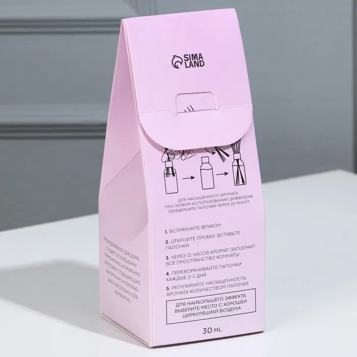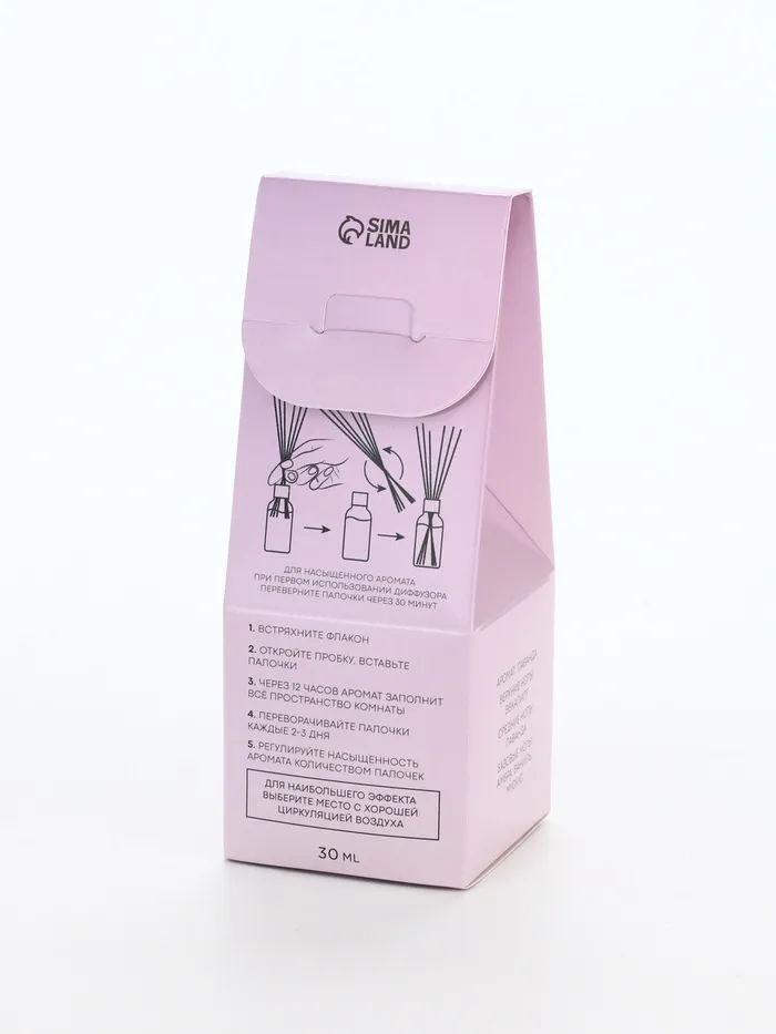 извлеките диффузор из упаковки, откройте крышку и защитный колпачок, опустите фибровые палочки в ароматизированную жидкость и наслаждайтесь. Ароматизированная жидкость пропитывает фибровые палочки, и, с их помощью аромат распространяется по всему помещению.