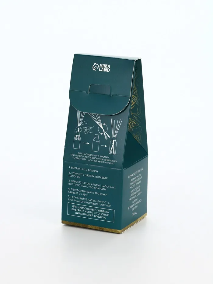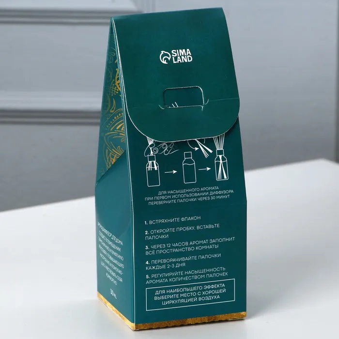 извлеките диффузор из упаковки, откройте крышку и защитный колпачок, опустите фибровые палочки в ароматизированную жидкость и наслаждайтесь. Ароматизированная жидкость пропитывает фибровые палочки, и, с их помощью аромат распространяется по всему помещению.