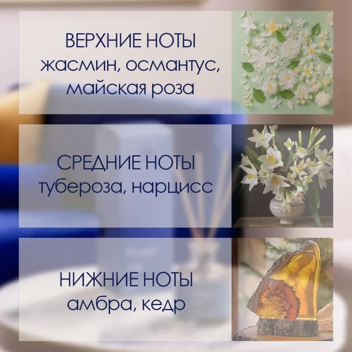 Его изысканная композиция раскрывается мягкой фруктово-цветочной сладостью османтуса и изящной свежестью нарцисса. Этот аромат переносит в весенний сад, наполненный светом и благоуханием цветов, создавая настроение гармонии, романтики и умиротворения.
