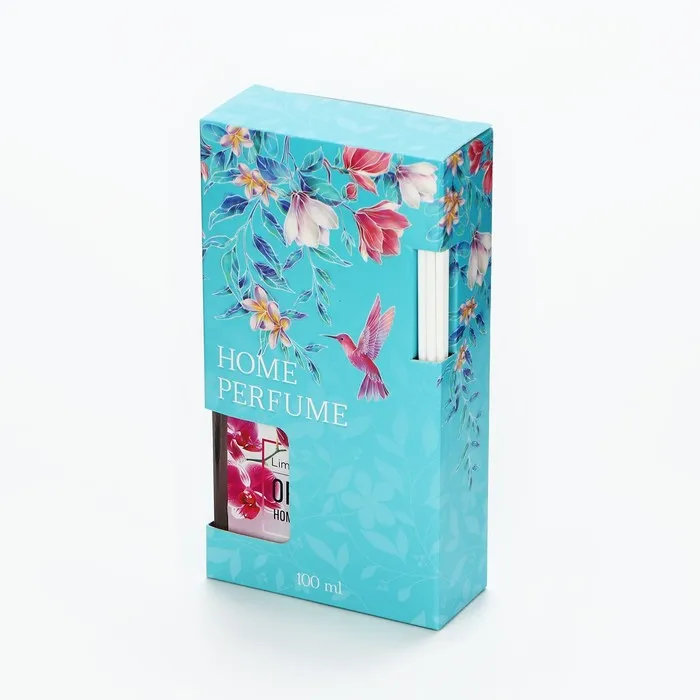 Диффузор упакован в красивую коробку с цветочным принтом и изображением колибри. Внутри вы найдете стеклянную бутылочку с ароматической жидкостью и набор палочек из микрофибры. Палочки впитывают аромат и распространяют его по всему помещению.