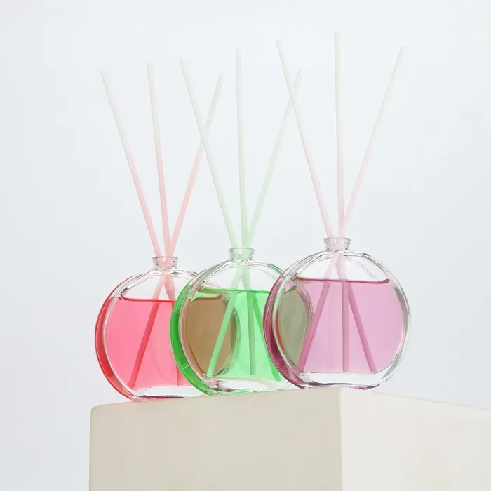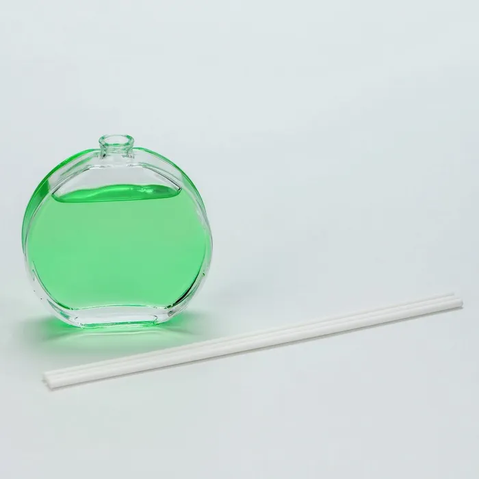 Диффузор выполнен в виде стеклянной бутылочки круглой формы, украшенной изображением цветов. В комплект входят палочки из натурального материала, которые впитывают аромат и распространяют его по комнате.