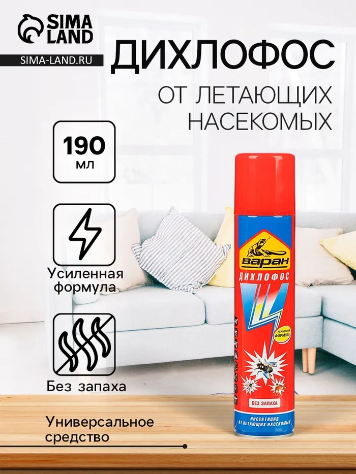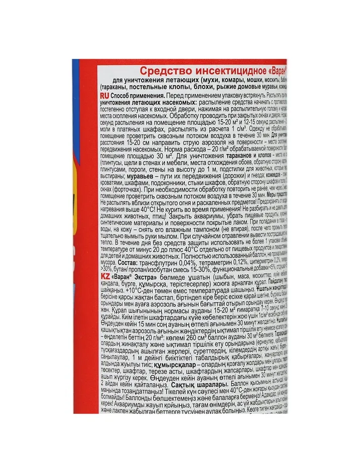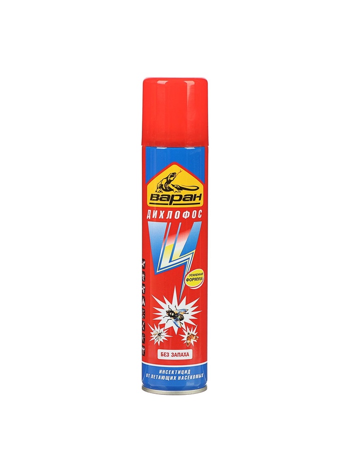 На природе и дома многие люди сталкиваются с клещами, клопами, москитами и другими опасными насекомыми, которые способны причинить массу вреда. Они переносят инфекцию, пьют вашу кровь и просто раздражают своим внешним видом. Вы устали бороться с ними? Дихлофос от торговой марки «Варан» — высокоэффективное средство для уничтожения ползающих (тараканов, муравьёв, клопов и т. д.), а также летающих насекомых (мух, москитов, комаров). Способ применения: перед использованием хорошо взболтайте, распылите. Состав: тетраметрин 0,12 %, циперметрин 0,2 %, пиперонилбутоксид 0,4 %, отдушка менее 5 %, функциональные добавки менее 5 %, смесь бутан / пропан / изобутан более 30 %, растворители более 30 %. Способ применения: перед использованием хорошо взболтайте, распылите.