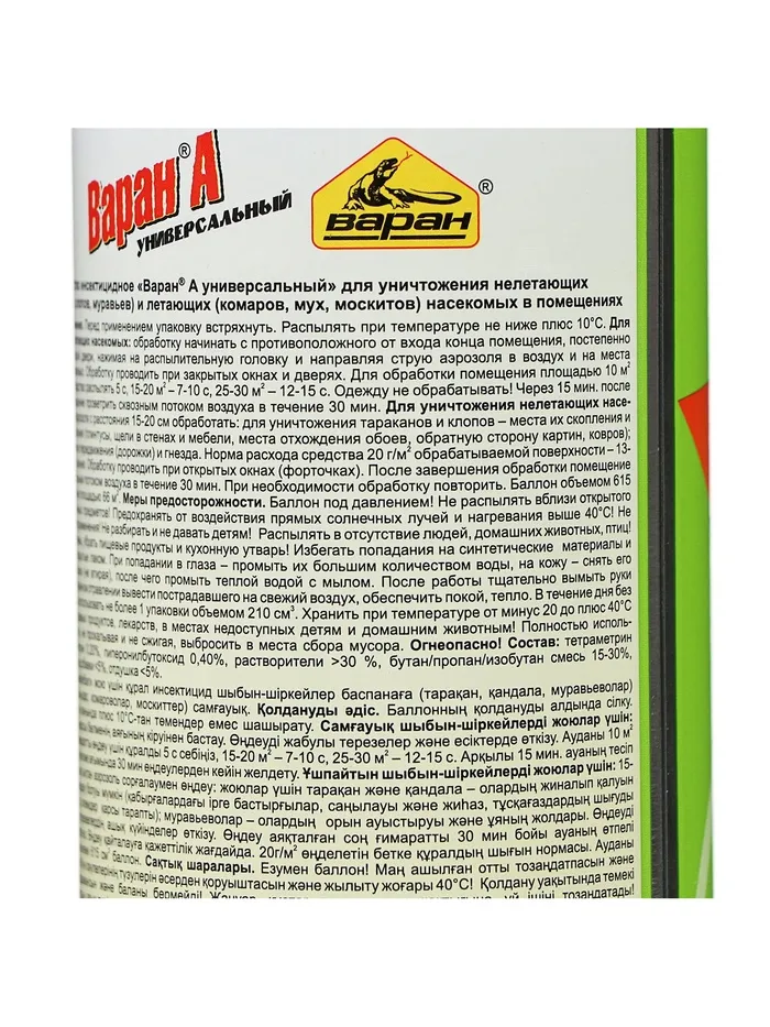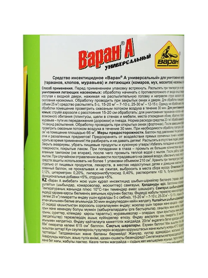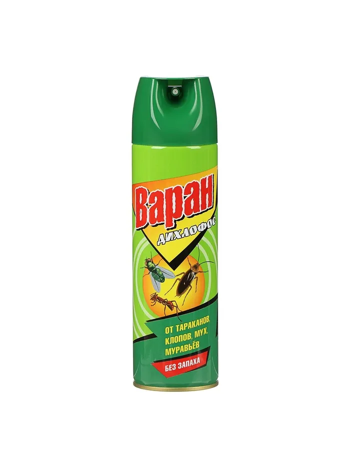 На природе и дома многие люди сталкиваются с клещами, клопами, москитами и другими опасными насекомыми, которые способны причинить массу вреда. Они переносят инфекцию, пьют вашу кровь и просто раздражают своим внешним видом. Вы устали бороться с ними? Дихлофос от торговой марки «Варан» — высокоэффективное средство для уничтожения ползающих (тараканов, муравьёв, клопов и т. д.), а также летающих насекомых (мух, москитов, комаров). Способ применения: перед использованием хорошо взболтайте, распылите. Состав: тетраметрин 0,12 %, циперметрин 0,2 %, пиперонилбутоксид 0,4 %, отдушка менее 5 %, функциональные добавки менее 5 %, смесь бутан / пропан / изобутан более 30 %, растворители более 30 %. Способ применения: перед использованием хорошо взболтайте, распылите.