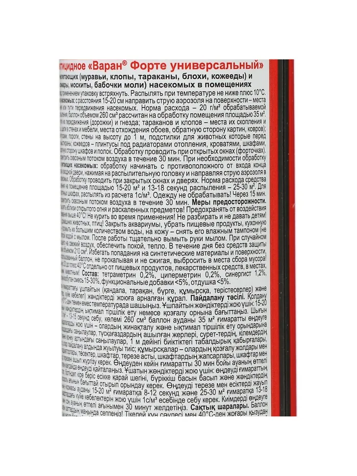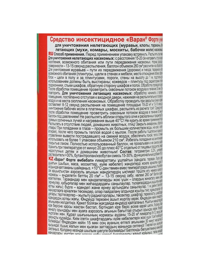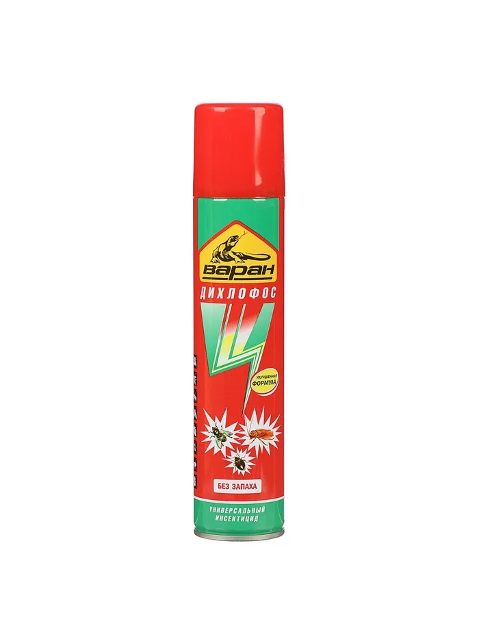 На природе и дома многие люди сталкиваются с клещами, клопами, москитами и другими опасными насекомыми, которые способны причинить массу вреда. Они переносят инфекцию, пьют вашу кровь и просто раздражают своим внешним видом. Вы устали бороться с ними? Дихлофос от торговой марки «Варан» — высокоэффективное средство для уничтожения ползающих (тараканов, муравьёв, клопов и т. д.), а также летающих насекомых (мух, москитов, комаров). Способ применения: перед использованием хорошо взболтайте, распылите. Состав: тетраметрин 0,12 %, циперметрин 0,2 %, пиперонилбутоксид 0,4 %, отдушка менее 5 %, функциональные добавки менее 5 %, смесь бутан / пропан / изобутан более 30 %, растворители более 30 %. Способ применения: перед использованием хорошо взболтайте, распылите.