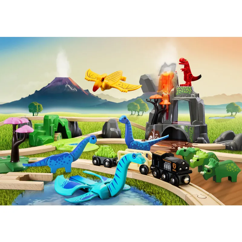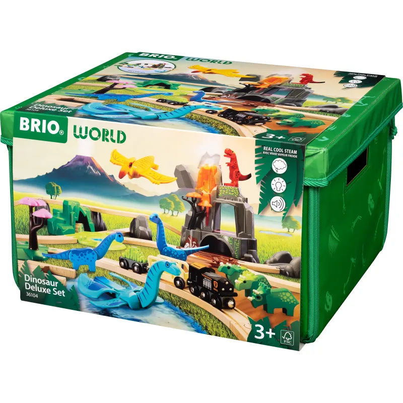 Погрузитесь в мир динозавров с набором Dinosaurus Deluxe от Brio. Этот железнодорожный набор перенесет вас в доисторические пейзажи, включая вулкан с реалистичными световыми, звуковыми и паровыми эффектами. В комплект входят восемь забавных и ярких фигурок динозавров с подвижными частями и классическими магнитами Brio. Удобная коробка для хранения превращается в игровую площадку, оживляя приключение с динозаврами!