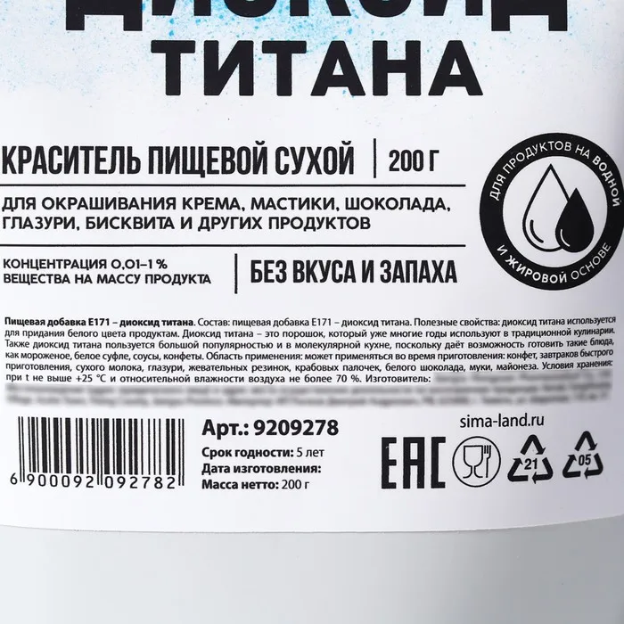 Полезные свойства: диоксид титана используется для придания белого цвета продуктам. Диоксид титана – это порошок, который уже многие годы используют в традиционной кулинарии. Также диоксид титана пользуется большой популярностью и в молекулярной кухне, поскольку даёт возможность готовить такие блюда, как мороженое, белое суфле, соусы, конфеты.