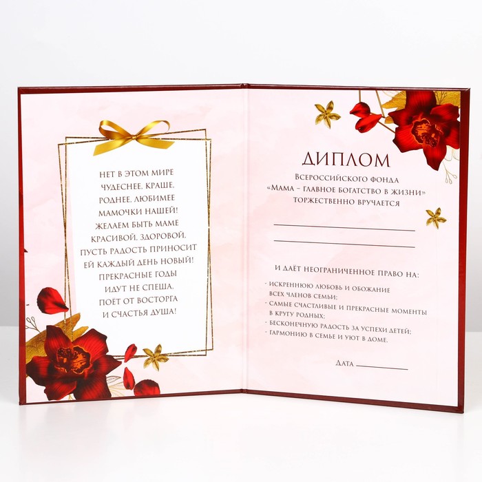 Праздничный диплом — прекрасный вариант оригинального поздравления. Изящные изображения, тёплые искренние слова, поле для имени получателя и список достижений — вот яркие черты этого аксессуара.
