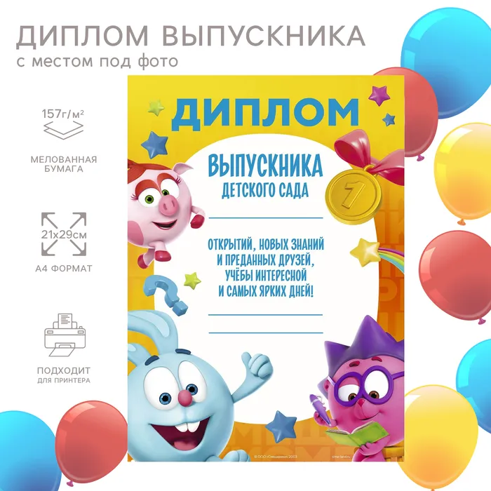 Диплом на выпускной «Выпускник детского сада» А4, Смешарики — Характеристики