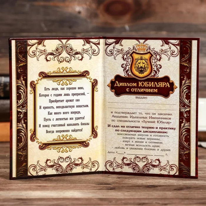 На любом торжестве есть место как серьёзным и официальным поздравлениям, так и весёлым шуткам! Традиционный формат, интересная обложка и позитивное содержание этого диплома украсят ваше мероприятие и позволят посмеяться от души.