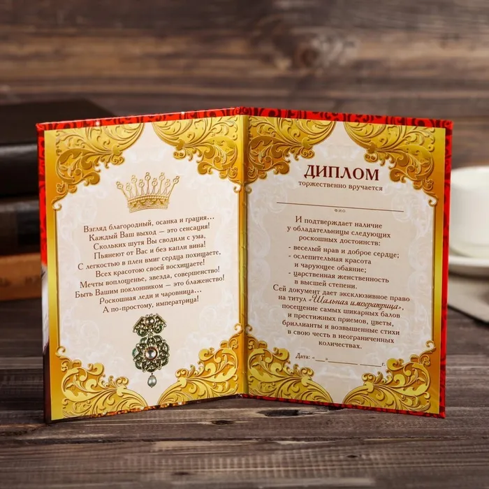 Диплом «Шальной императрицы» — прекрасный вариант оригинального поздравления. Изящные изображения, тёплые искренние слова, поле для имени получателя и список достижений — вот яркие черты этого аксессуара.
