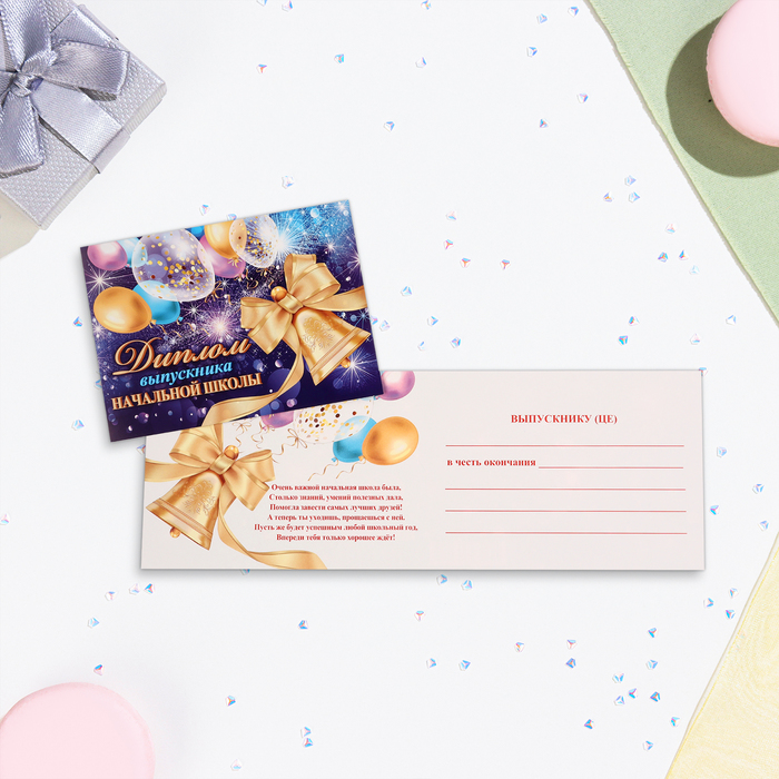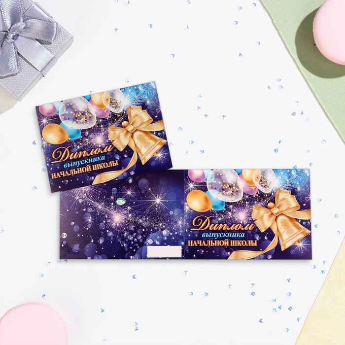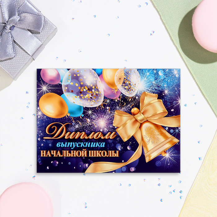 Диплом "Выпускнику начальной школы!" шары на фиолетовом фоне, картон, 22х16,5 см — Характеристики
