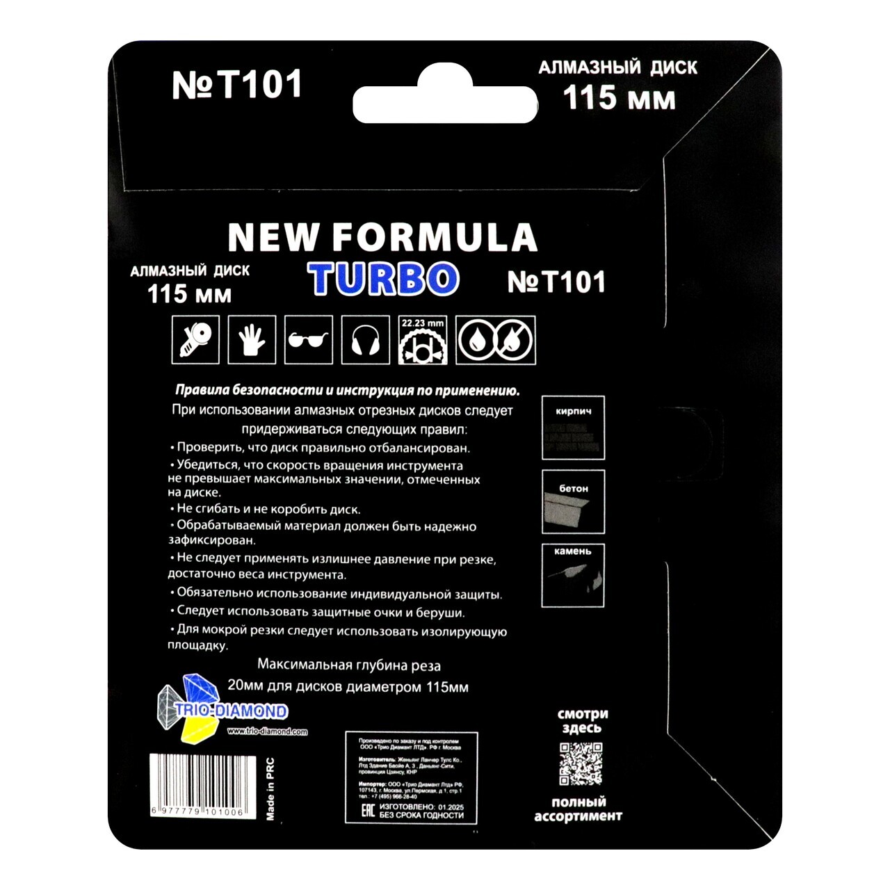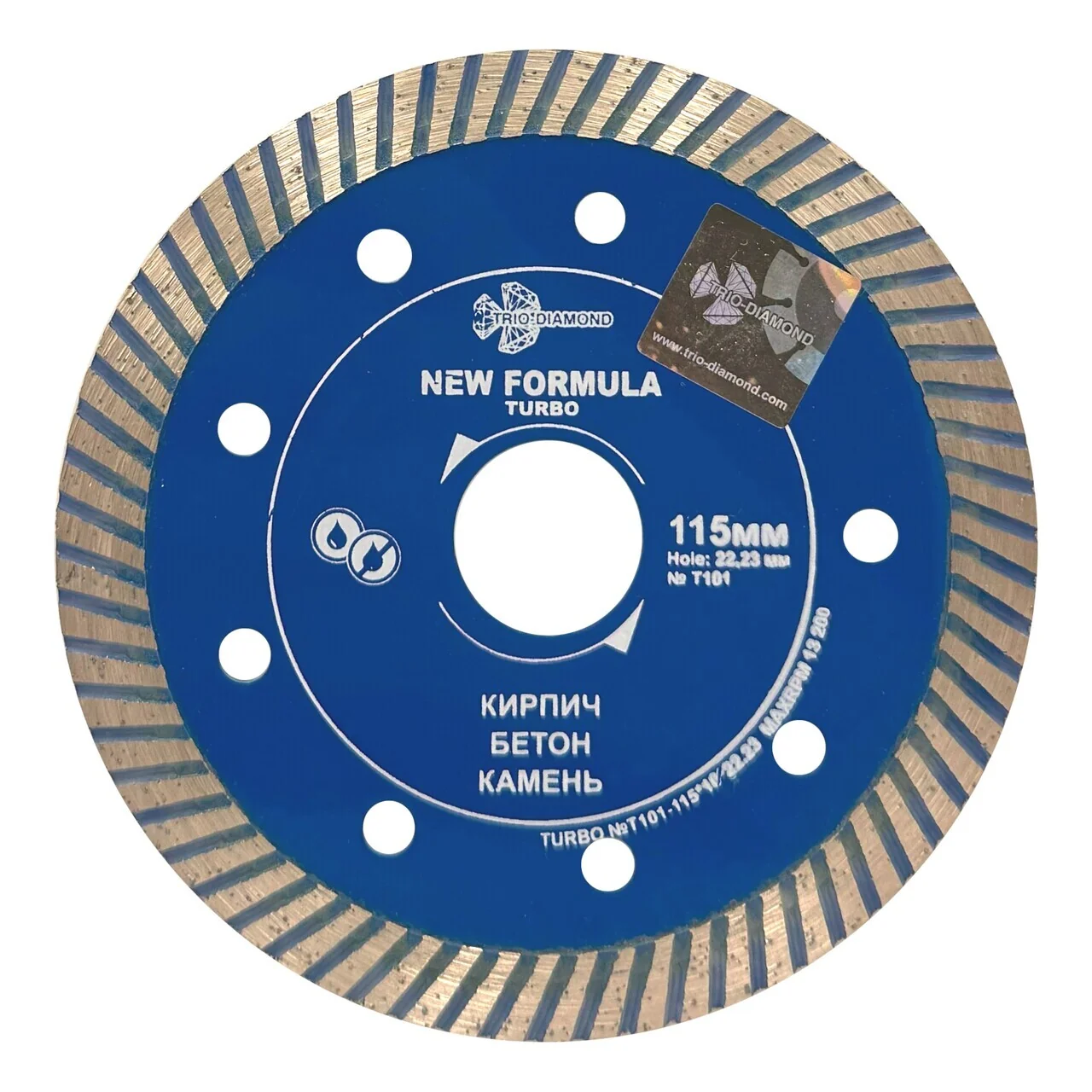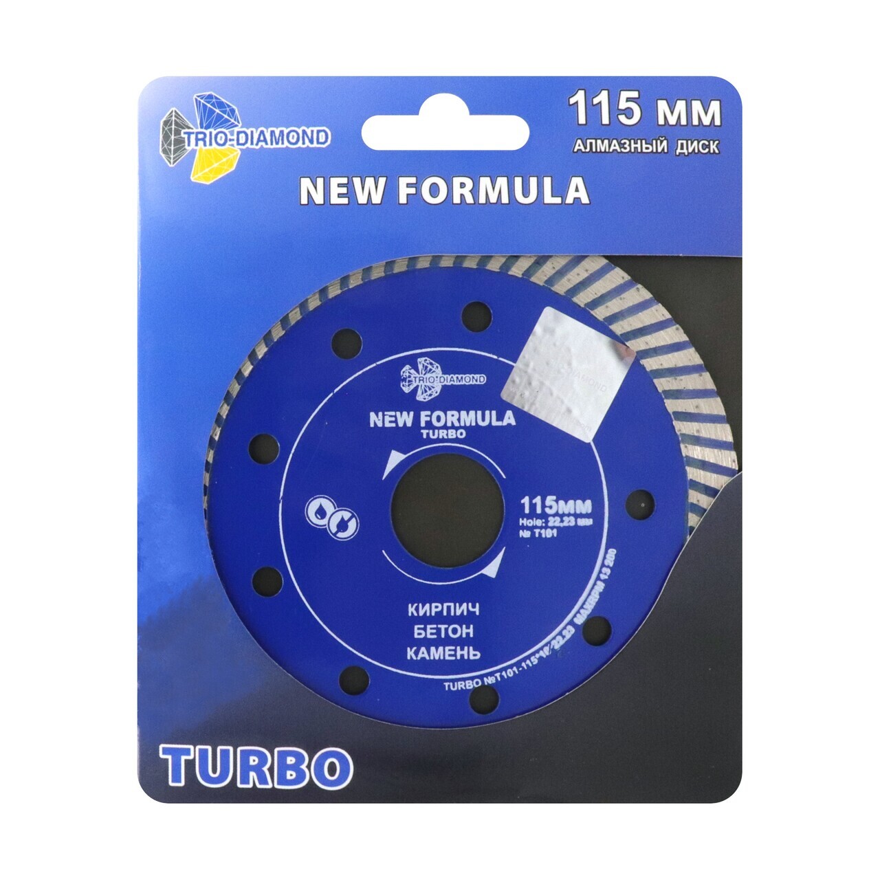 Диск TRIO-DIAMOND T101 выполнен с использованием технологии холодного прессования, что обеспечивает долговечность и надежность. Турбо-режущая кромка высотой 10 мм и толщиной 2,2 мм позволяет выполнять резы глубиной до 20 мм.