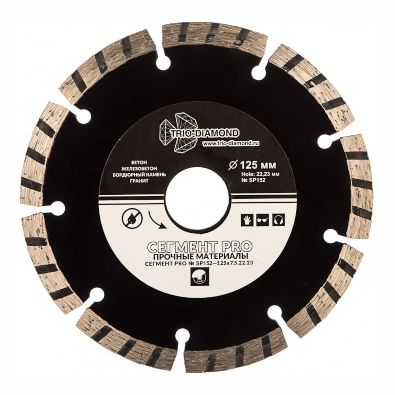 Диск диаметром 125 мм и посадочным диаметром 22,23 мм обладает сегментно-турбо кромкой, что обеспечивает высокую производительность. Высота режущей кромки 8 мм и технология холодного прессования гарантируют долговечность и стойкость к износу.