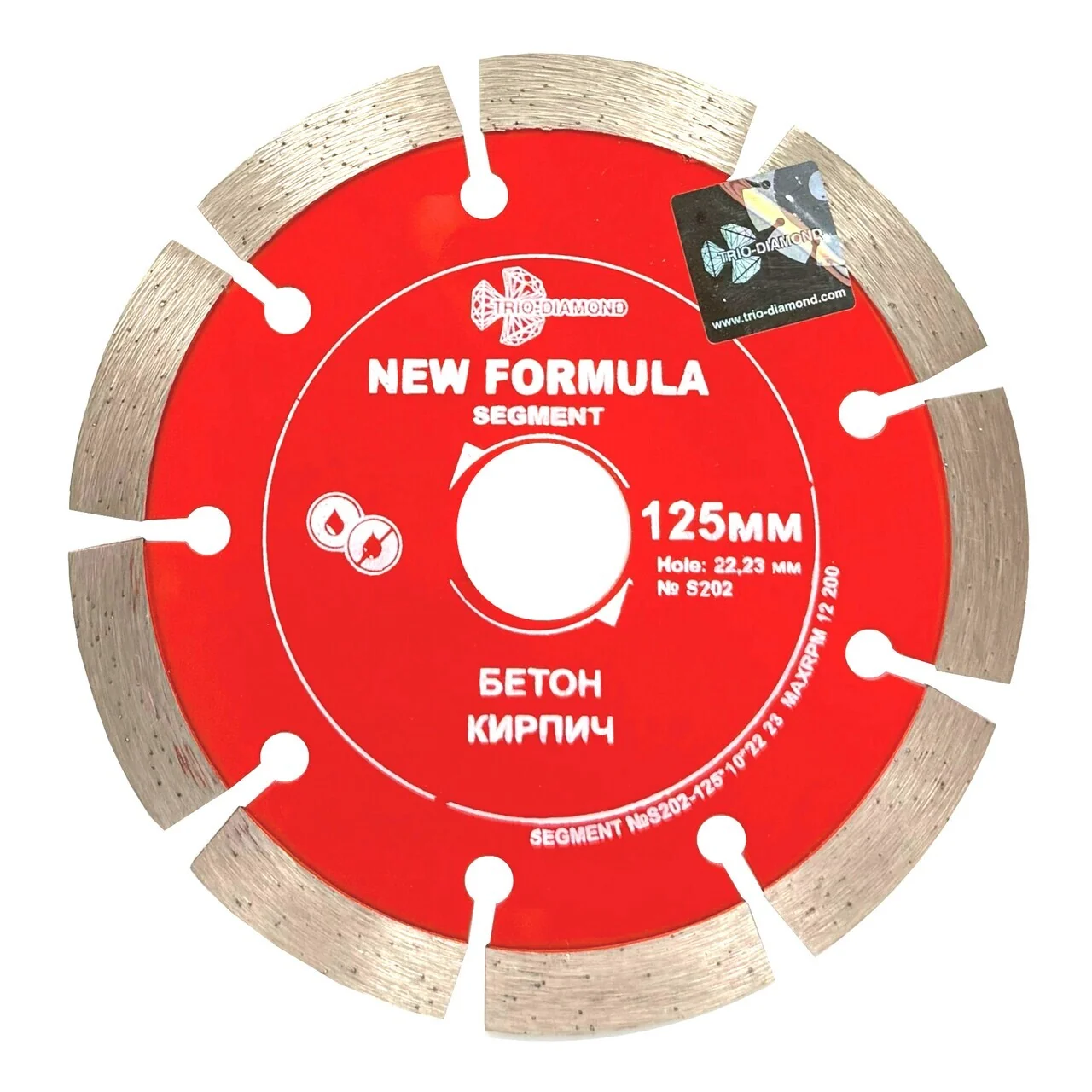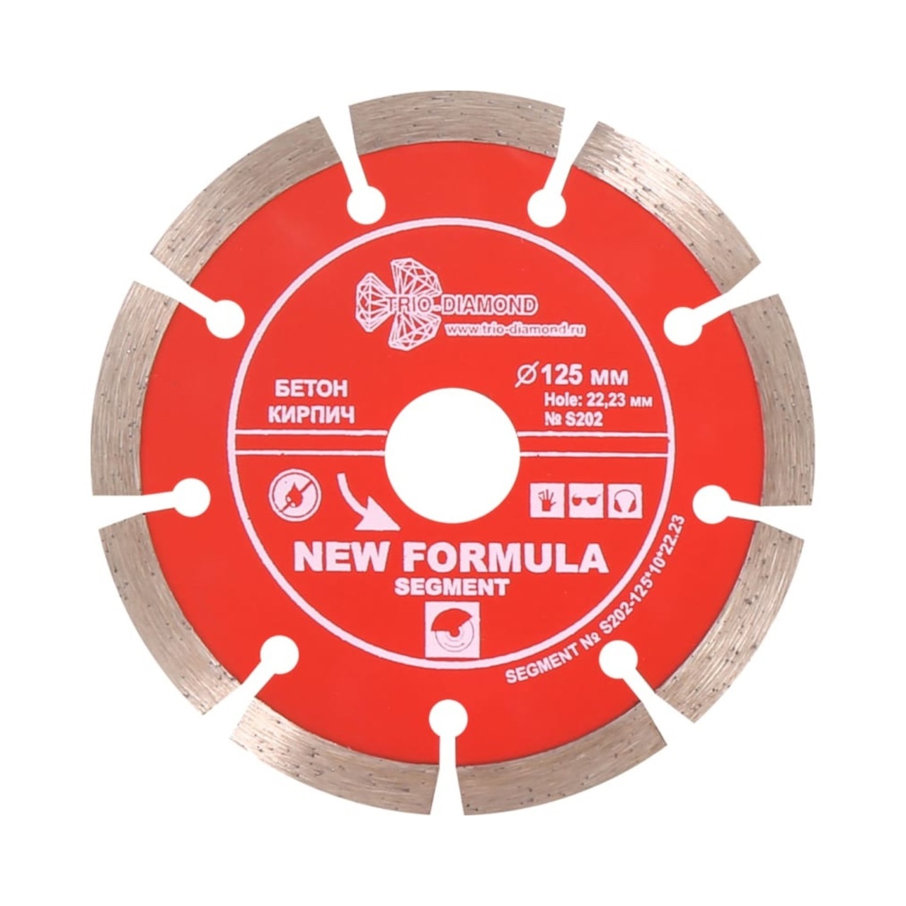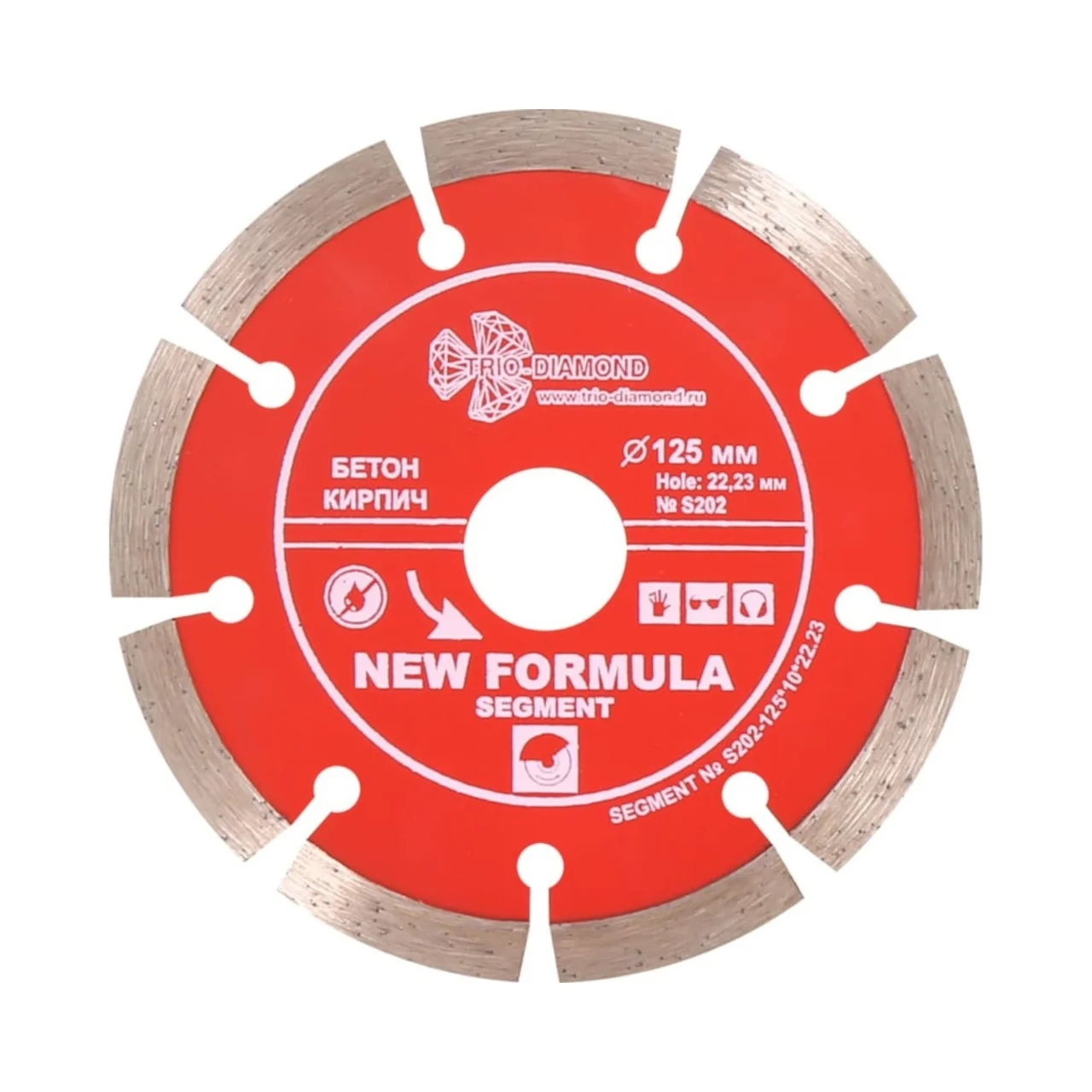 Диск отрезной TRIO-DIAMOND серии New Formula Segment диаметром 125 мм и посадочным диаметром 22,23 мм изготовлен по технологии холодного прессования. Сегментная режущая кромка высотой 10 мм и толщиной 2,2 мм обеспечивает качественный рез.