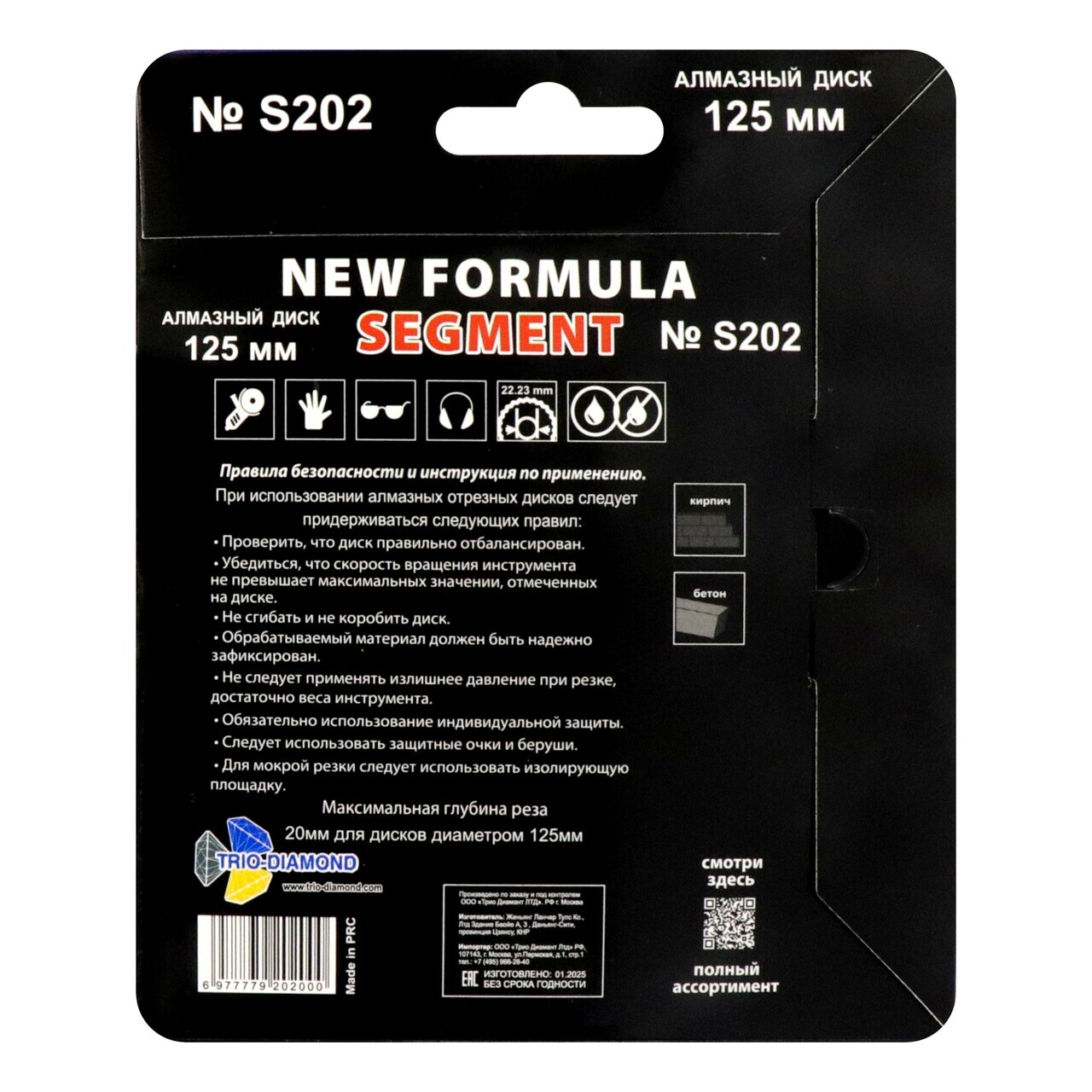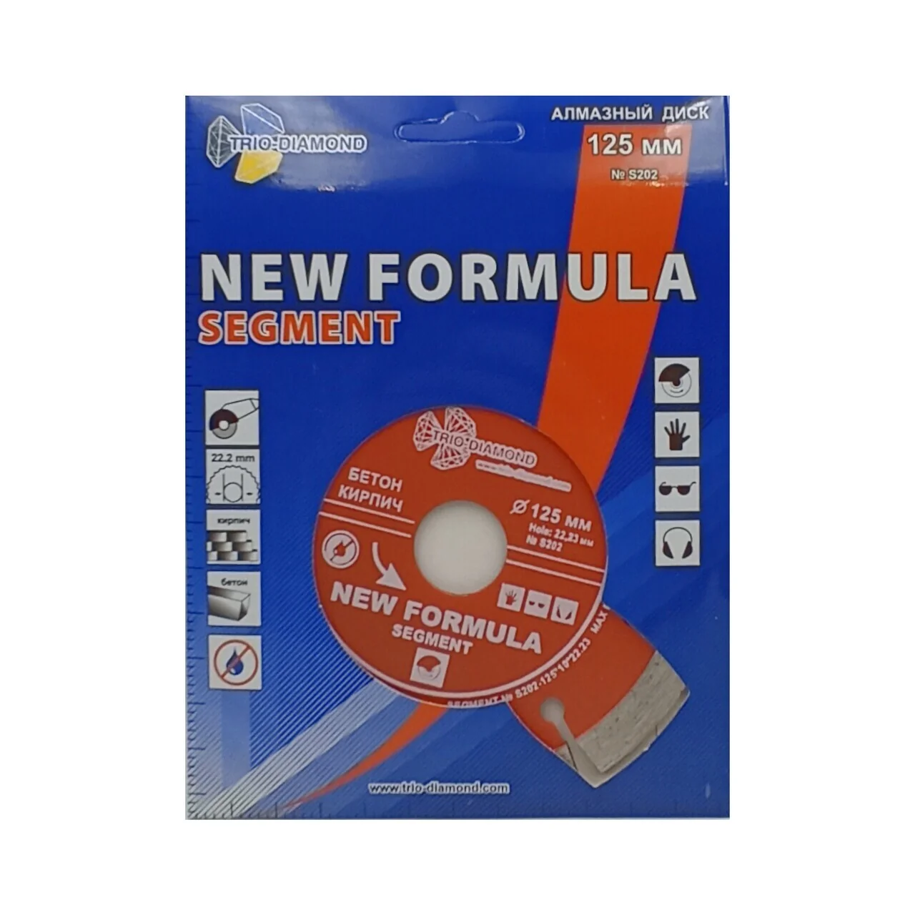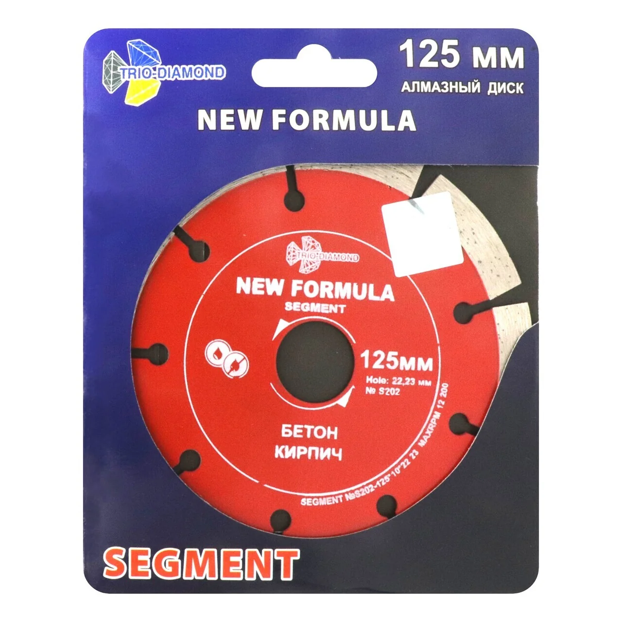 Диск отрезной TRIO-DIAMOND серии New Formula Segment диаметром 125 мм и посадочным диаметром 22,23 мм изготовлен по технологии холодного прессования. Сегментная режущая кромка высотой 10 мм и толщиной 2,2 мм обеспечивает качественный рез.