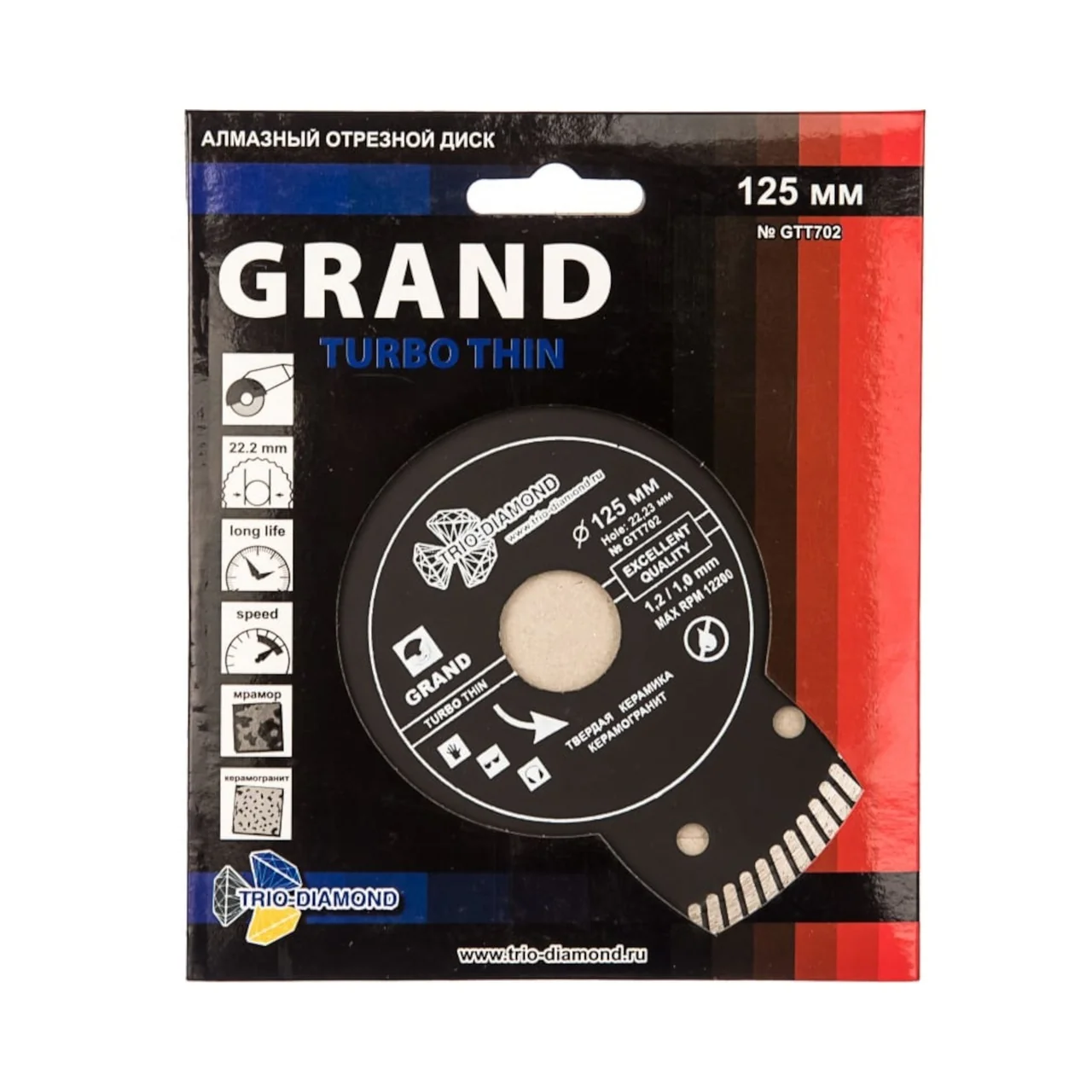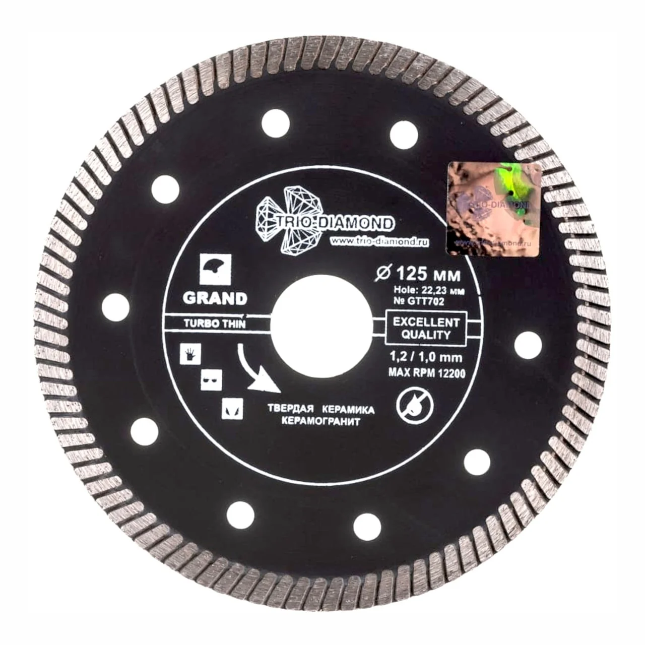 Диск алмазный отрезной серии Grand Thin Turbo от TRIO-DIAMOND — идеальный инструмент для профессионалов, работающих с различными видами плитки. Он позволяет быстро и точно резать керамогранит, мраморную и гранитную плитку, а также керамическую плитку, обеспечивая чистый и аккуратный рез без сколов.