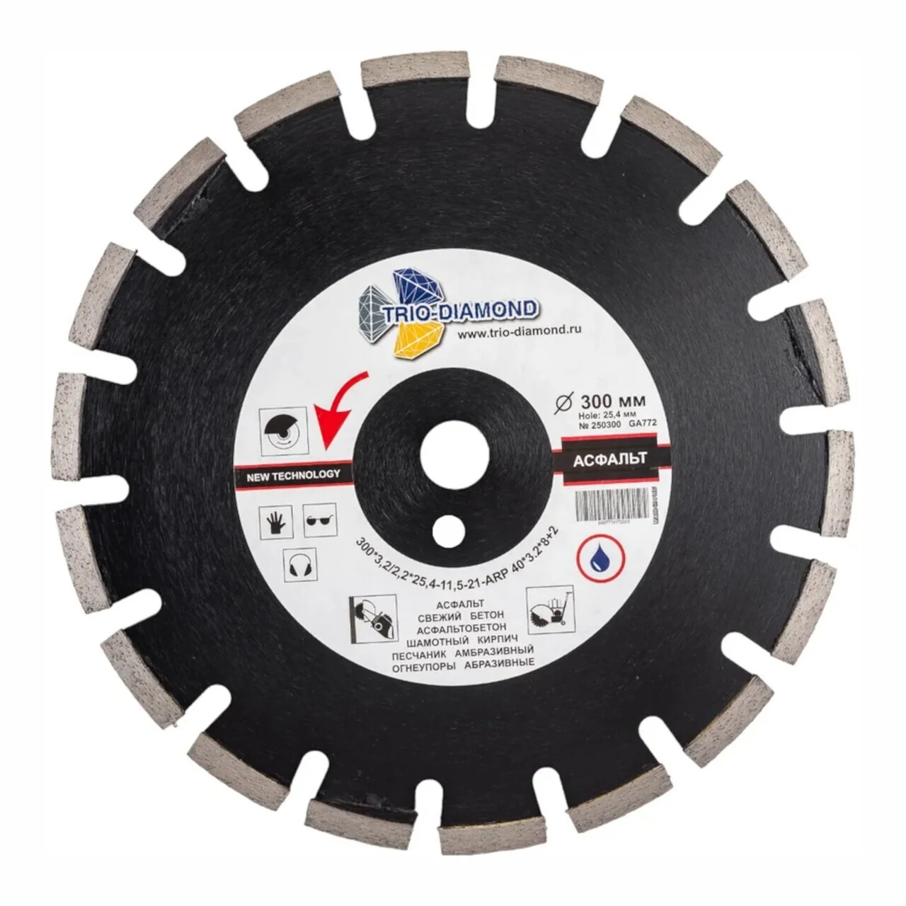 Диск алмазный отрезной GA772 от TRIO-DIAMOND идеально подходит для резки асфальта, асфальтобетона и свежего бетона. Используйте его с бензорезами и швонарезчиками для быстрого и точного выполнения дорожных и строительных работ.
