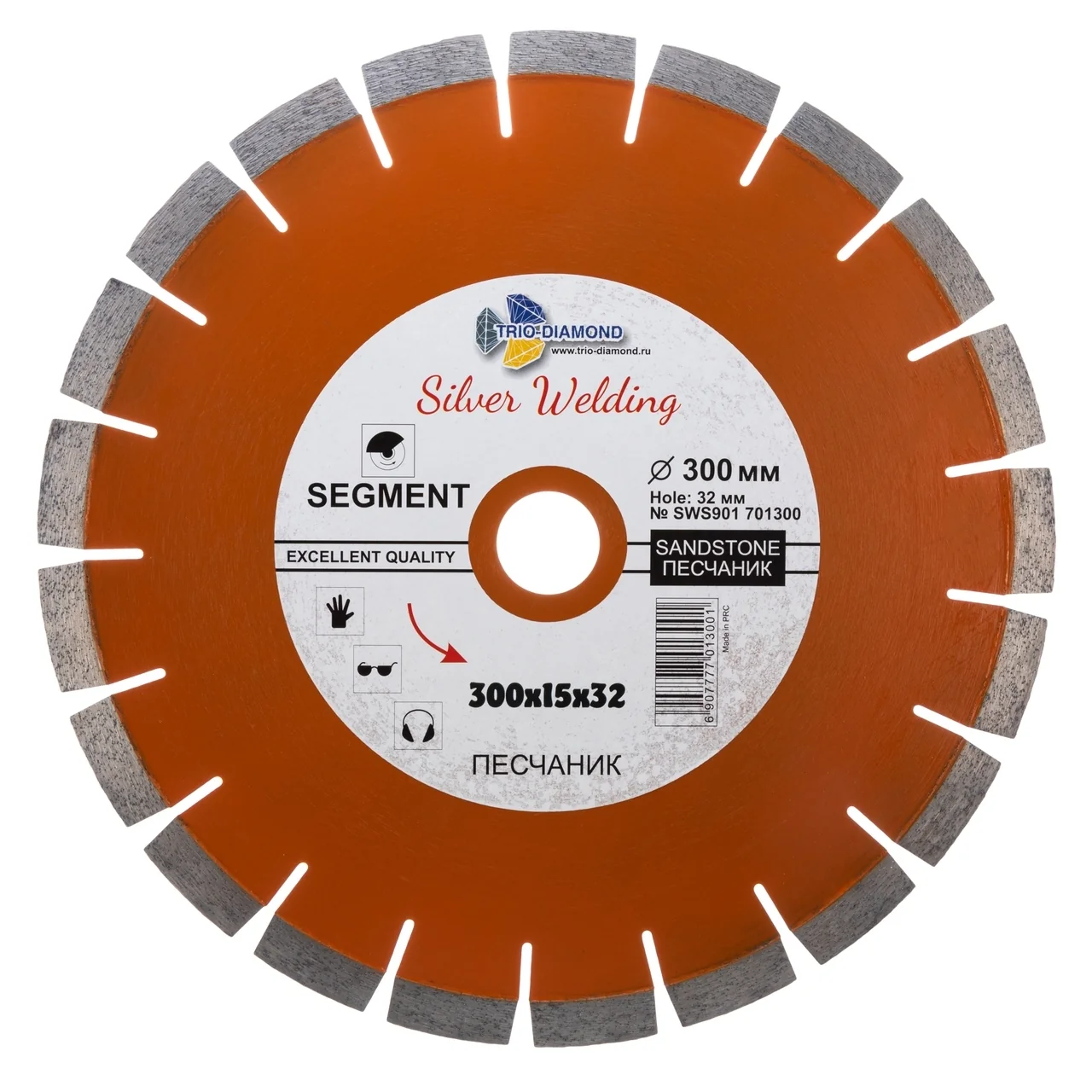 Диск диаметром 300 мм с посадочным диаметром 32/25.4 мм и сегментной кромкой высотой 15 мм гарантирует надежную производительность и долговечность. Изготовленный по технологии серебряной пайки, он обеспечивает стабильную работу при мокром типе реза.