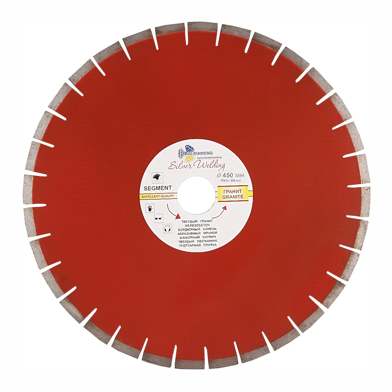 Диск диаметром 450 мм и посадочным отверстием 50 мм выполнен с использованием технологии серебряной пайки и имеет сегментированную кромку. Это гарантирует долговечность и надежность в процессе работы.