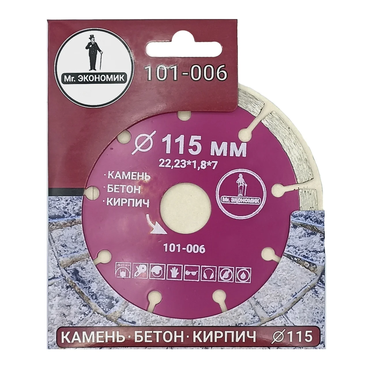 Диск алмазный сегментный 115*22,23 мм Mr. ЭКОНОМИК предназначен для точной и быстрой резки разнообразных материалов, таких как бетон, камень, кирпич, бордюрный камень и тротуарная плитка. Идеален для использования с угловыми шлифовальными машинами (УШМ) при строительных и ремонтных работах.