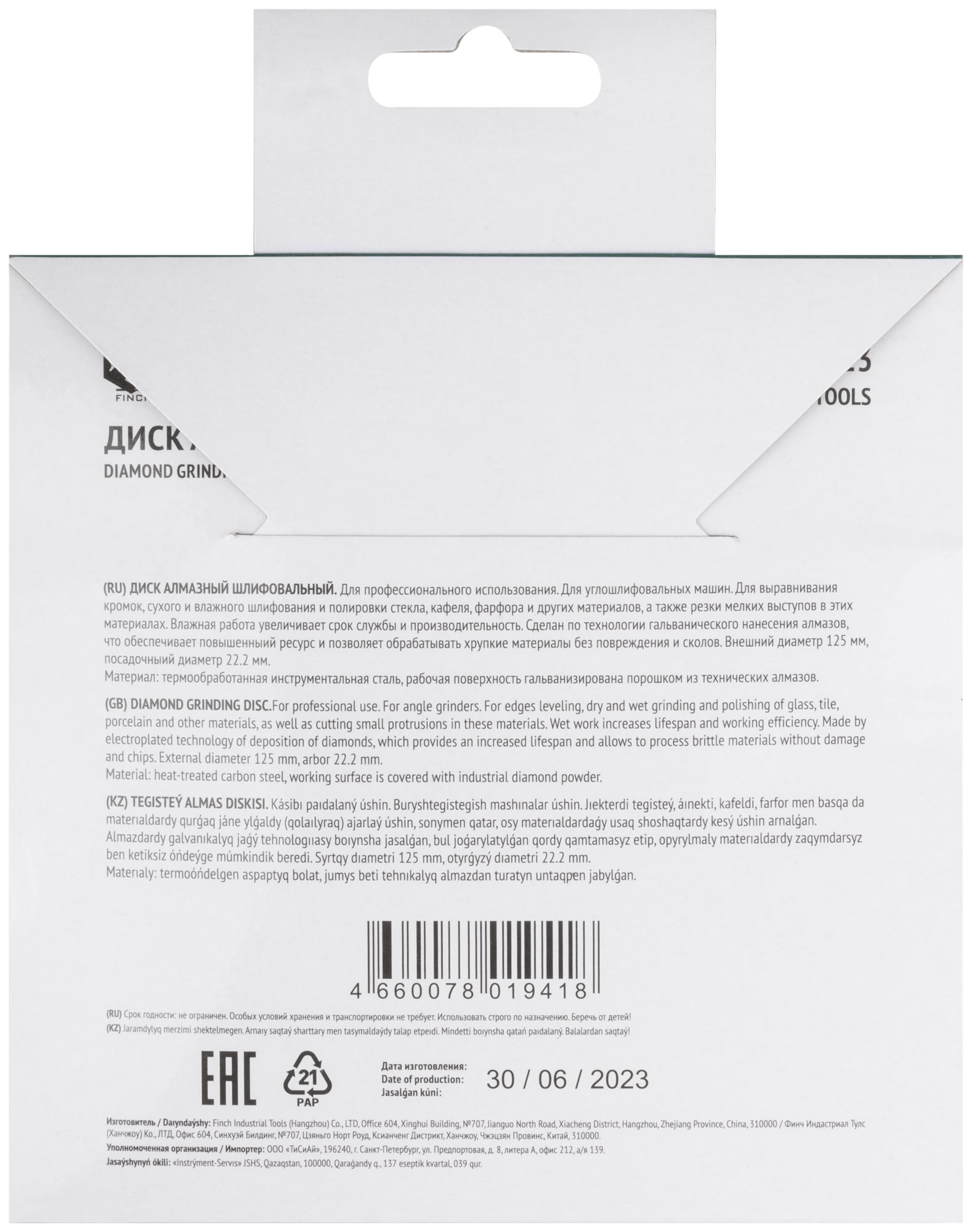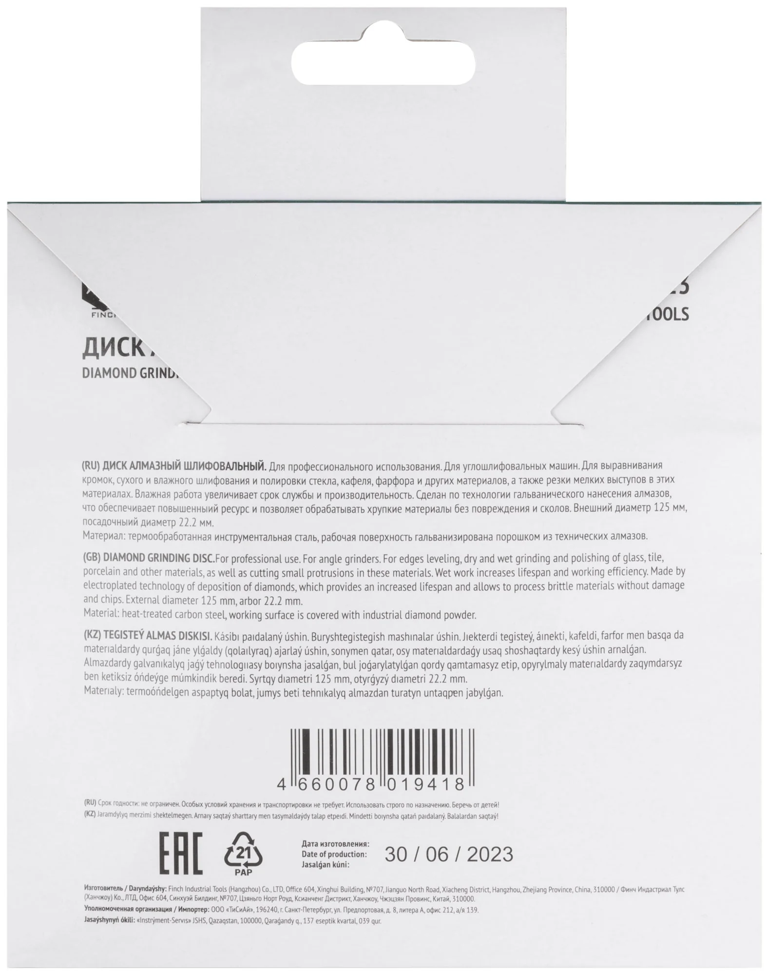 Диск обладает сплошной рабочей поверхностью диаметром 125 мм и посадочным диаметром 22,2 мм, что обеспечивает универсальное применение с большинством углошлифовальных машин. Изготовлен с использованием гальванизации порошком из технических алмазов, что гарантирует долговечность и высокую производительность.