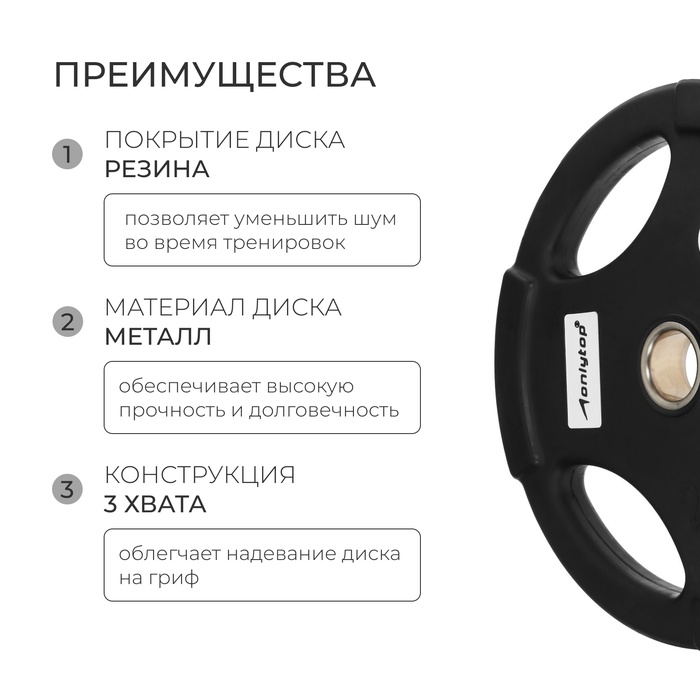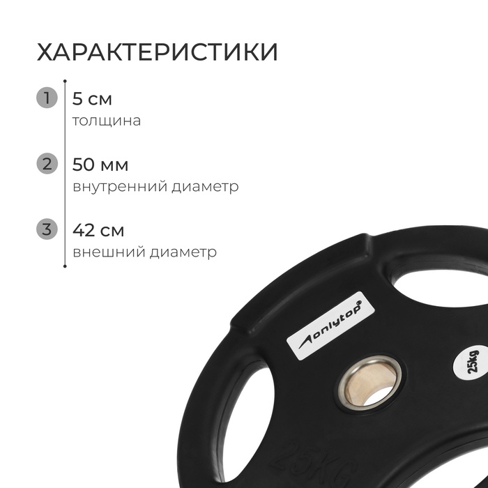 Диск олимпийский ONLYTOP, обрезиненный, с тройным хватом, 25 кг, d=50 мм — Характеристики