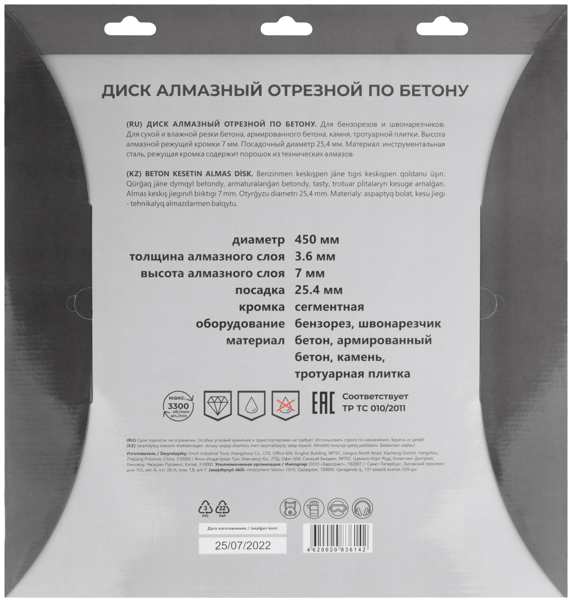 Изготовленный из инструментальной стали, диск имеет режущую кромку с порошком из технических алмазов, что обеспечивает долговечность и высокую производительность. Высота алмазной кромки составляет 7 мм, а посадочный диаметр — 25,4 мм, что делает его универсальным для большинства инструментов.