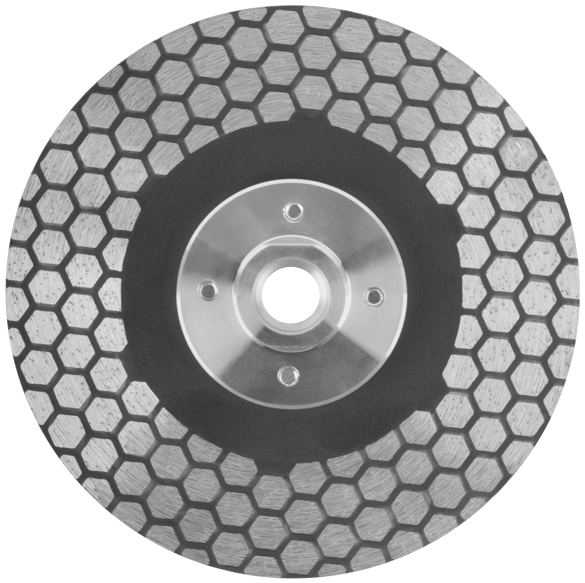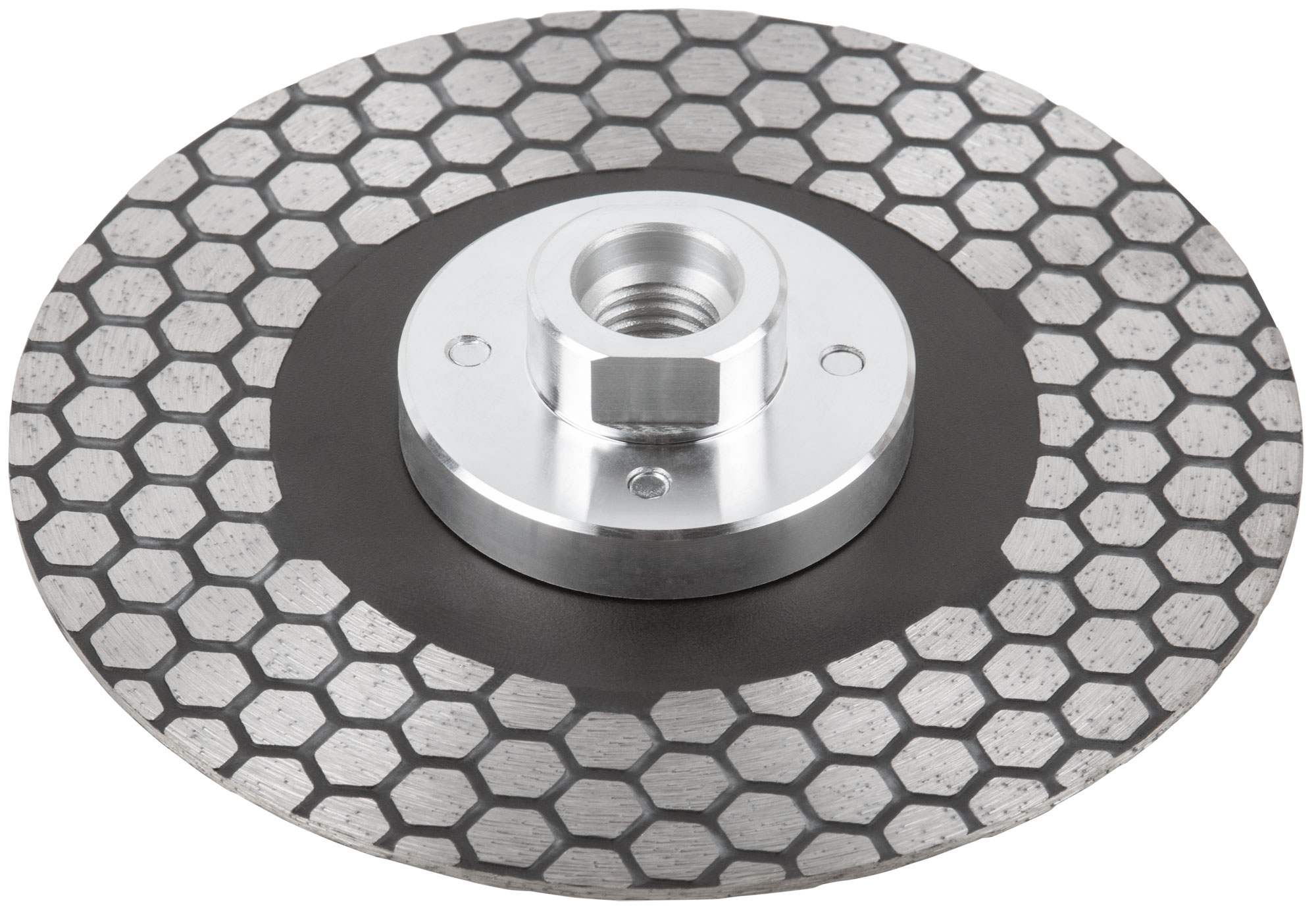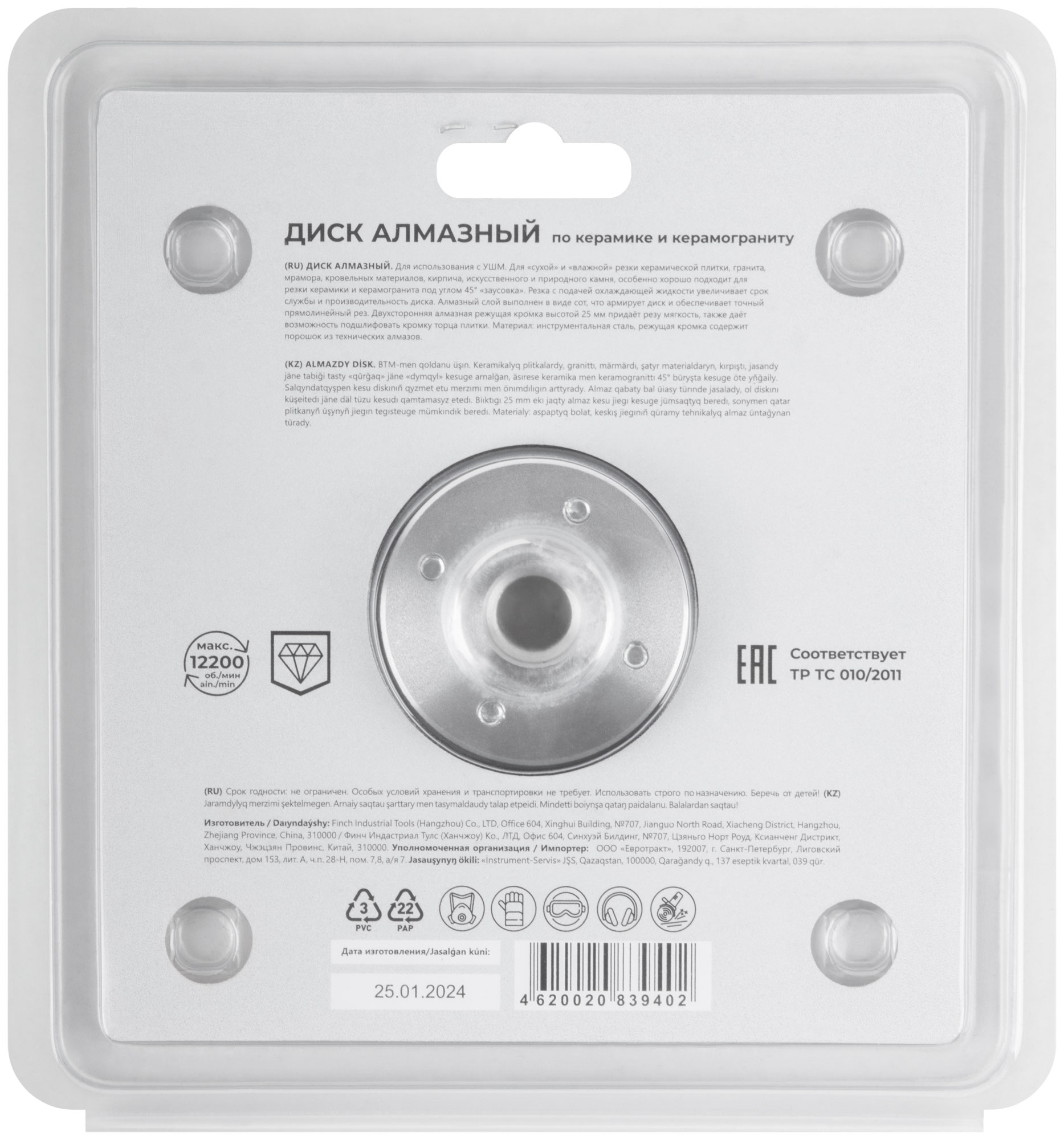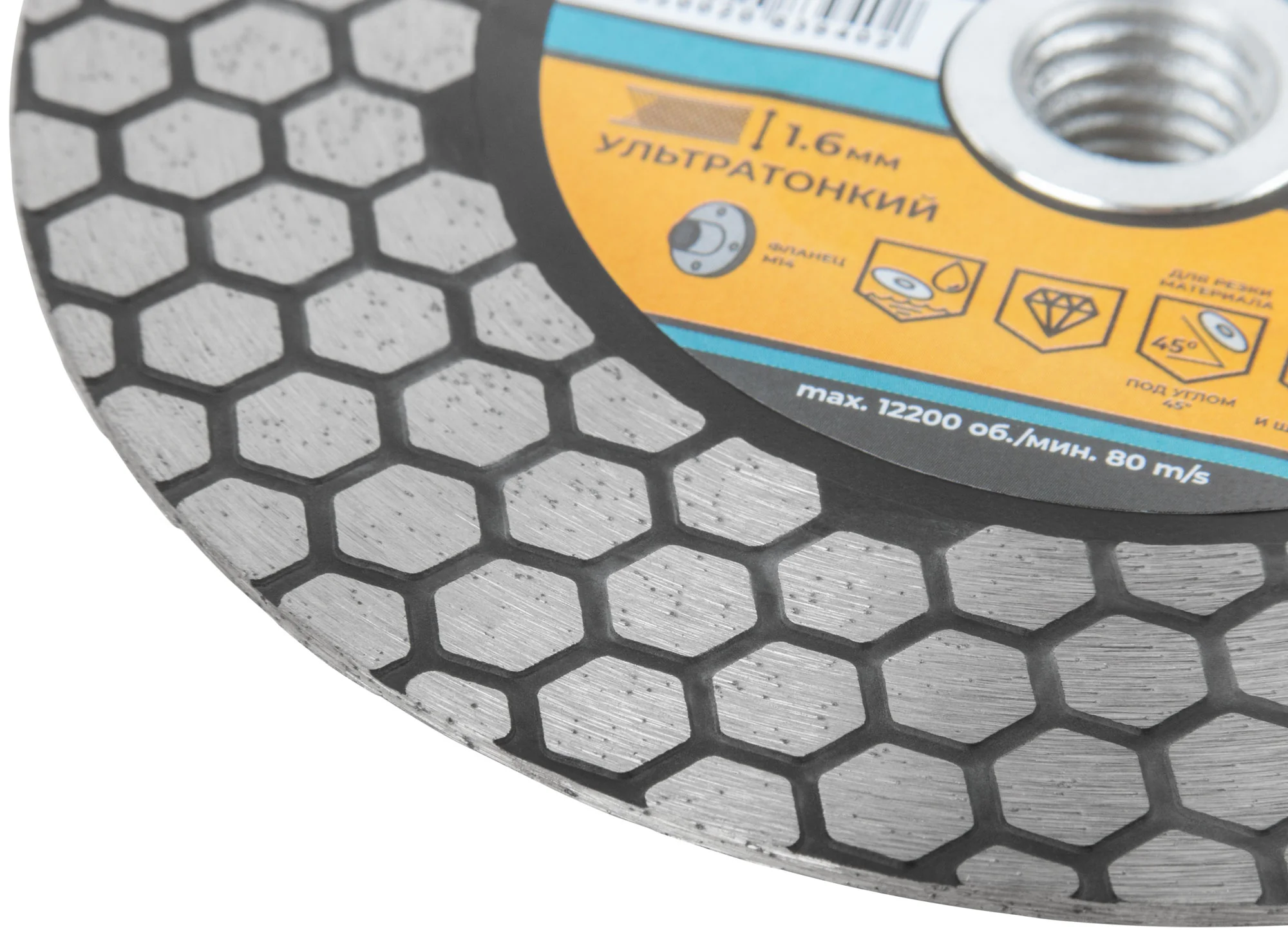 Диск имеет толщину 1,6 мм и выполнен из инструментальной стали с алмазной режущей кромкой высотой 25 мм. Алмазный слой в виде сот обеспечивает точный и прямолинейный рез, а также мягкость при подшлифовке кромки плитки.